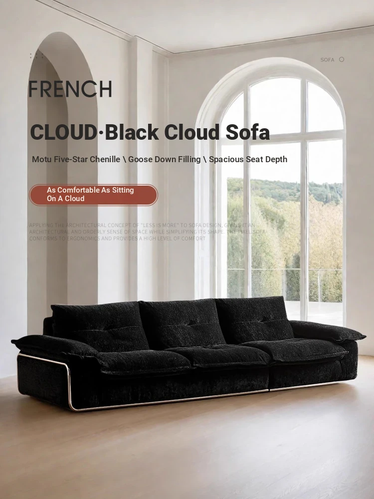 French Vintage Sofa for Small Spaces - Minimalist High-Back Design, Removable and Washable, Black Chenille Upholstery for a Stylish Living Room