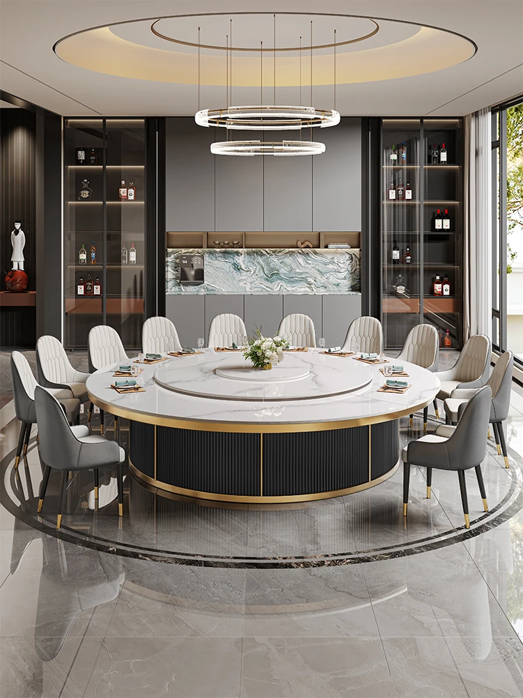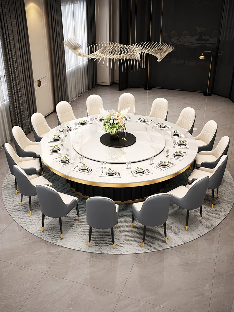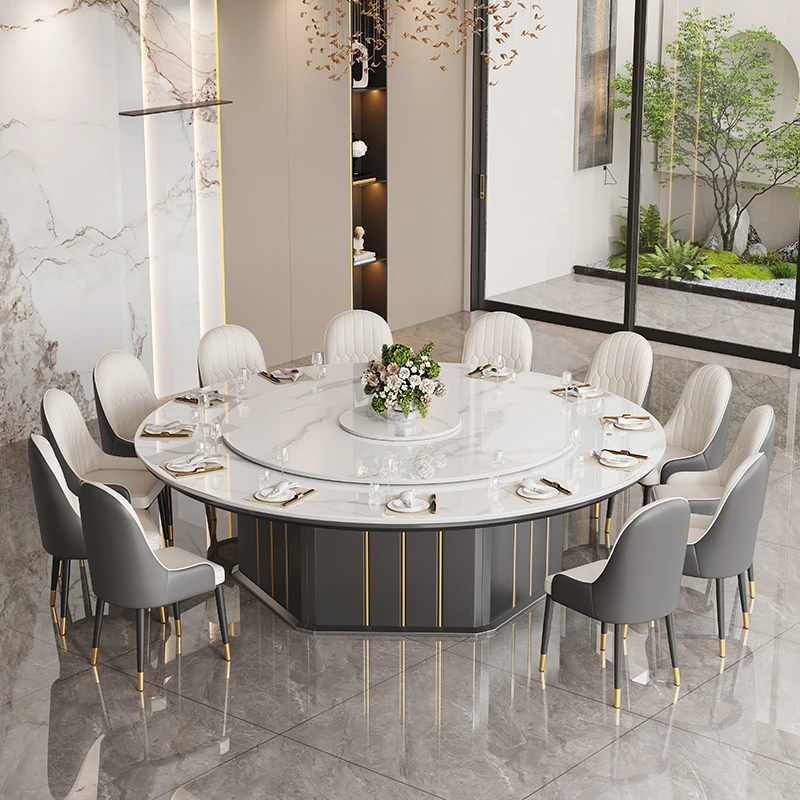 大人数対応!20人用電動回転式岩板ホテルダイニングテーブル - 家庭用電磁調理器付き、火鍋も楽しめる!15人用椅子付き、特別な集まりに最適な豪華な食卓!