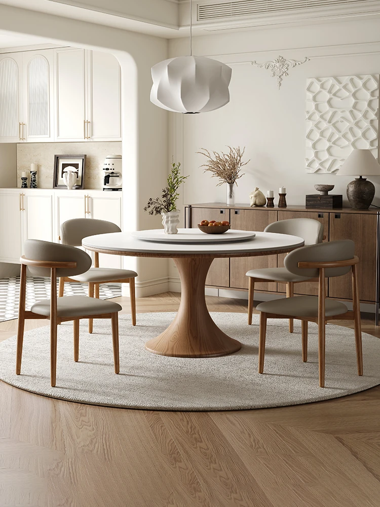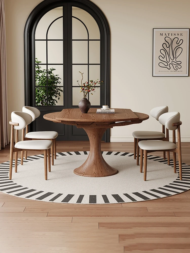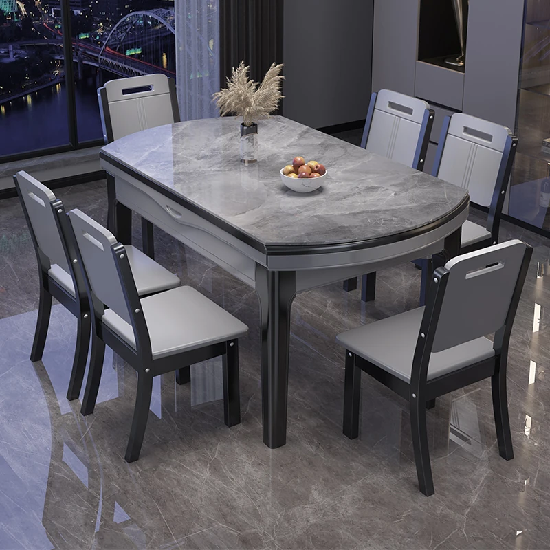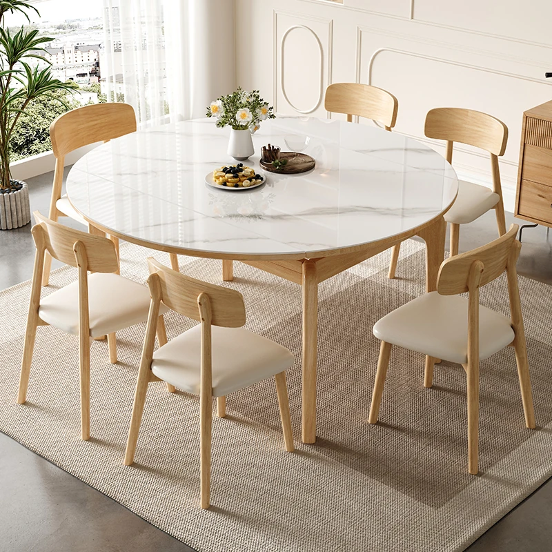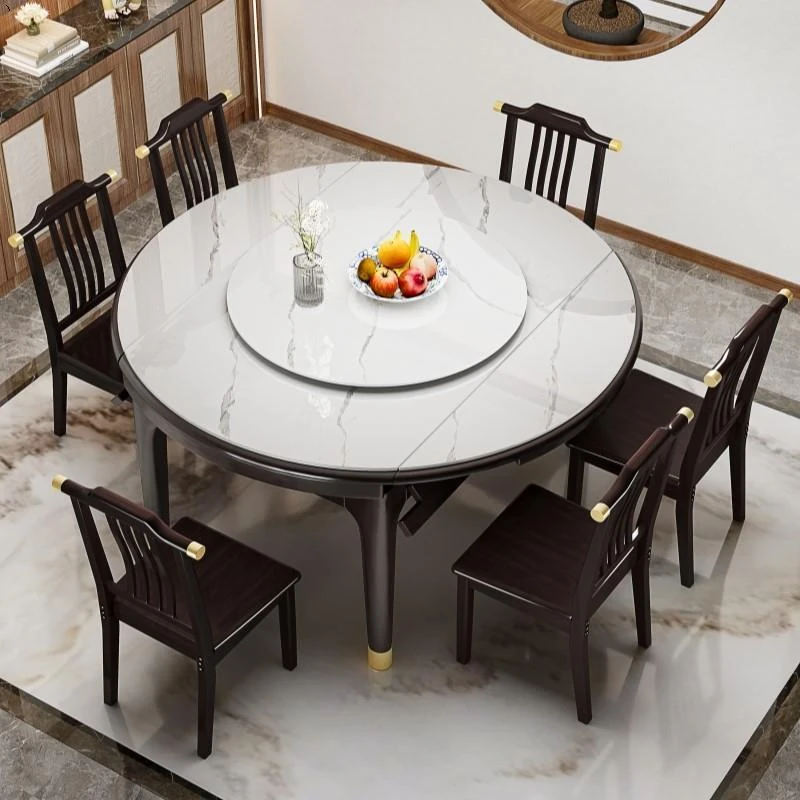 無垢材のロックボードダイニングテーブル&チェアセット、伸縮可能なモダンミニマリストデザイン。新中式の折りたたみラウンドテーブルで、軽やかな贅沢感を演出。家庭での食事を特別な時間に変えます!