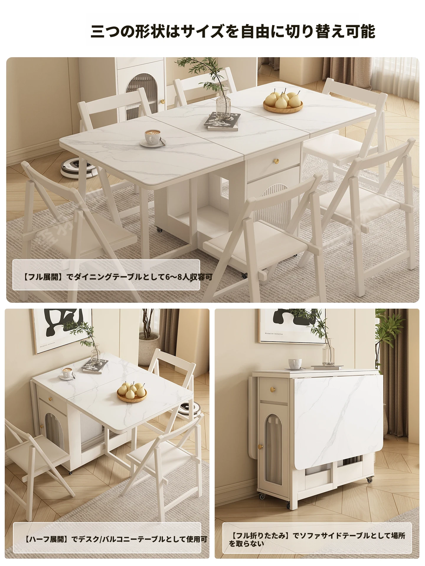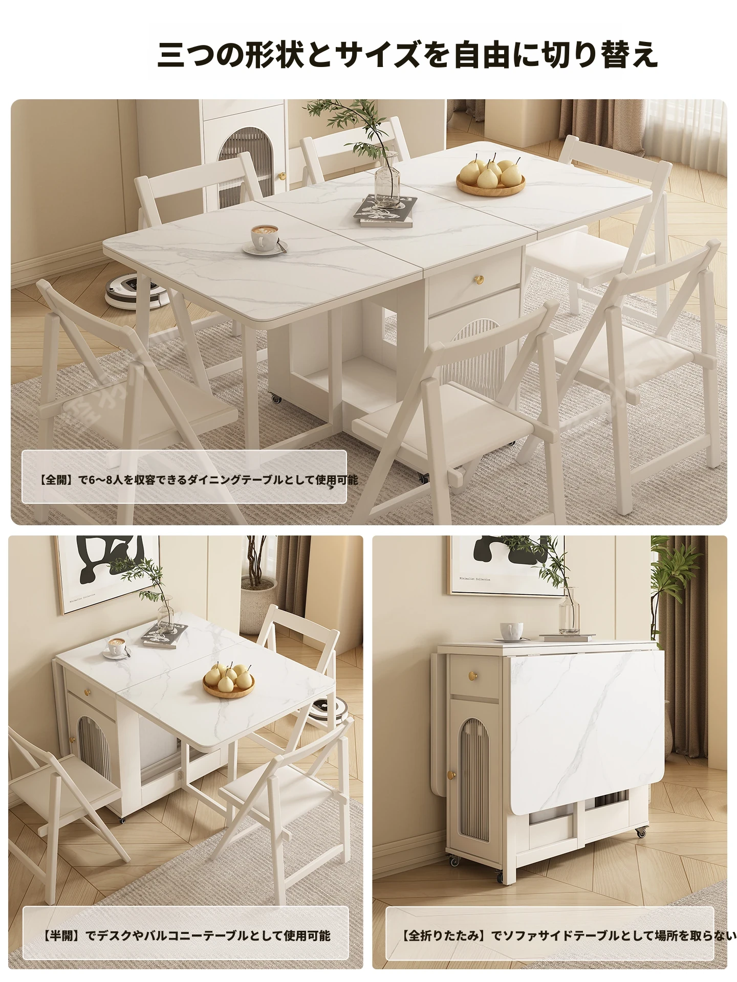クリーム風の折りたたみ岩板ダイニングテーブル&チェアセット - スリムで小型のリビングに最適!壁際収納も可能な長方形デザイン、家族や友人との食事をおしゃれに楽しみましょう。