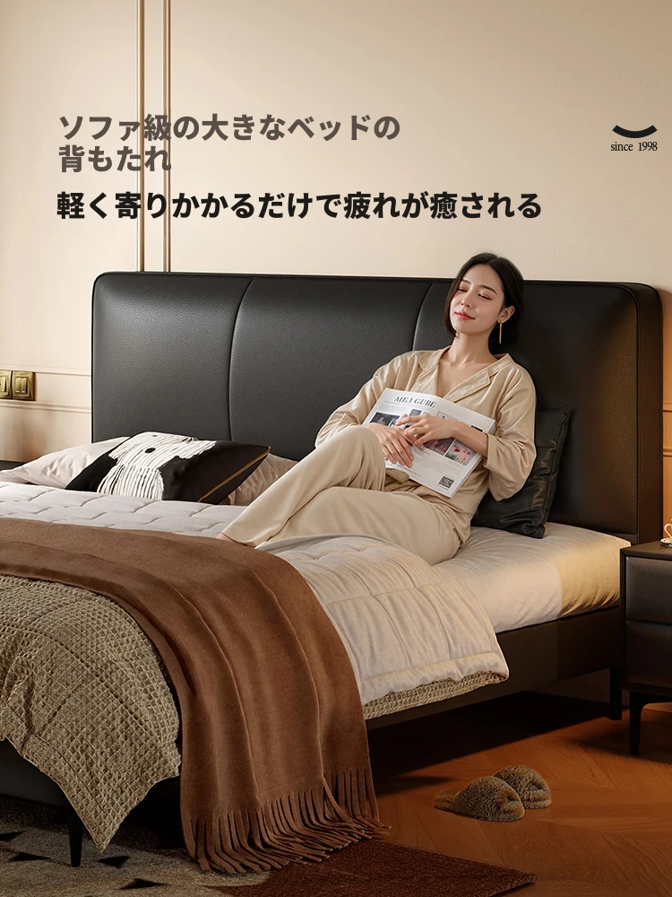 ラグジュアリーなレザー仕上げ!モダンでミニマルなデザインの「浪度伊云」真皮高脚ダブルベッド。主寝室にぴったりな、心地よさとスタイルを兼ね備えた大床で、あなたの夢の空間を演出します!