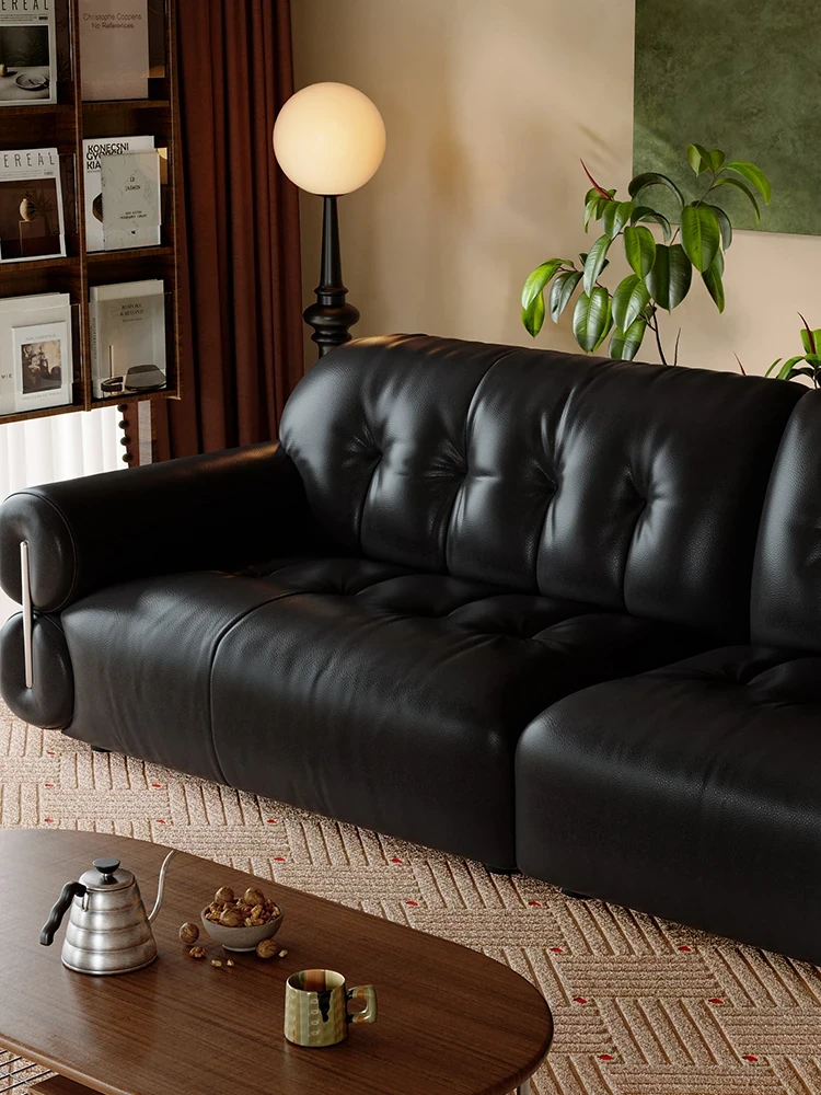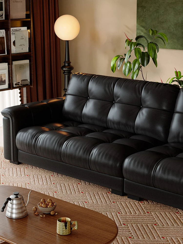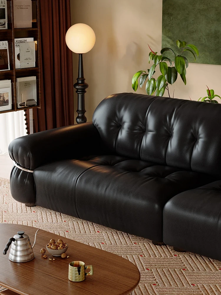 Lando Audrey Genuine Leather Sofa - Vintage Chic Luxury with Black Sugar Cloud Design, Made from Top-Grain Black Leather for a Timeless Living Room Aesthetic.