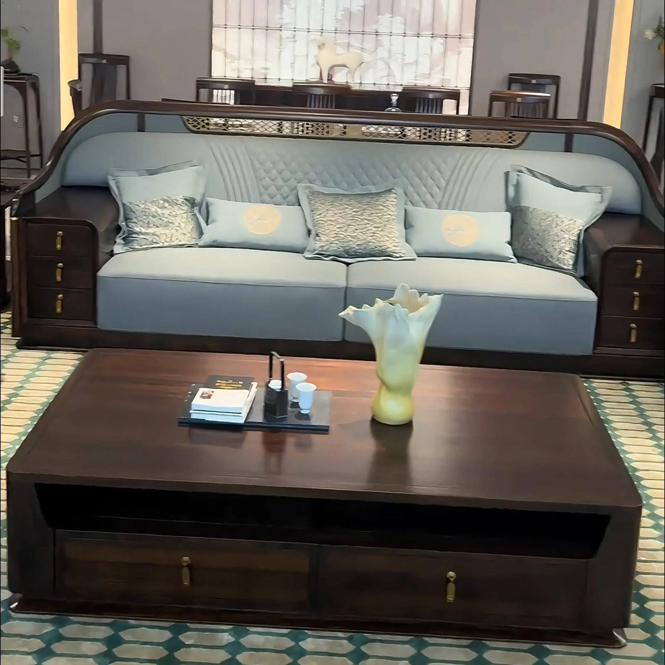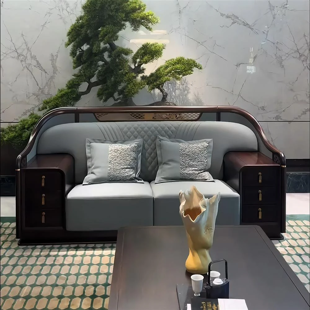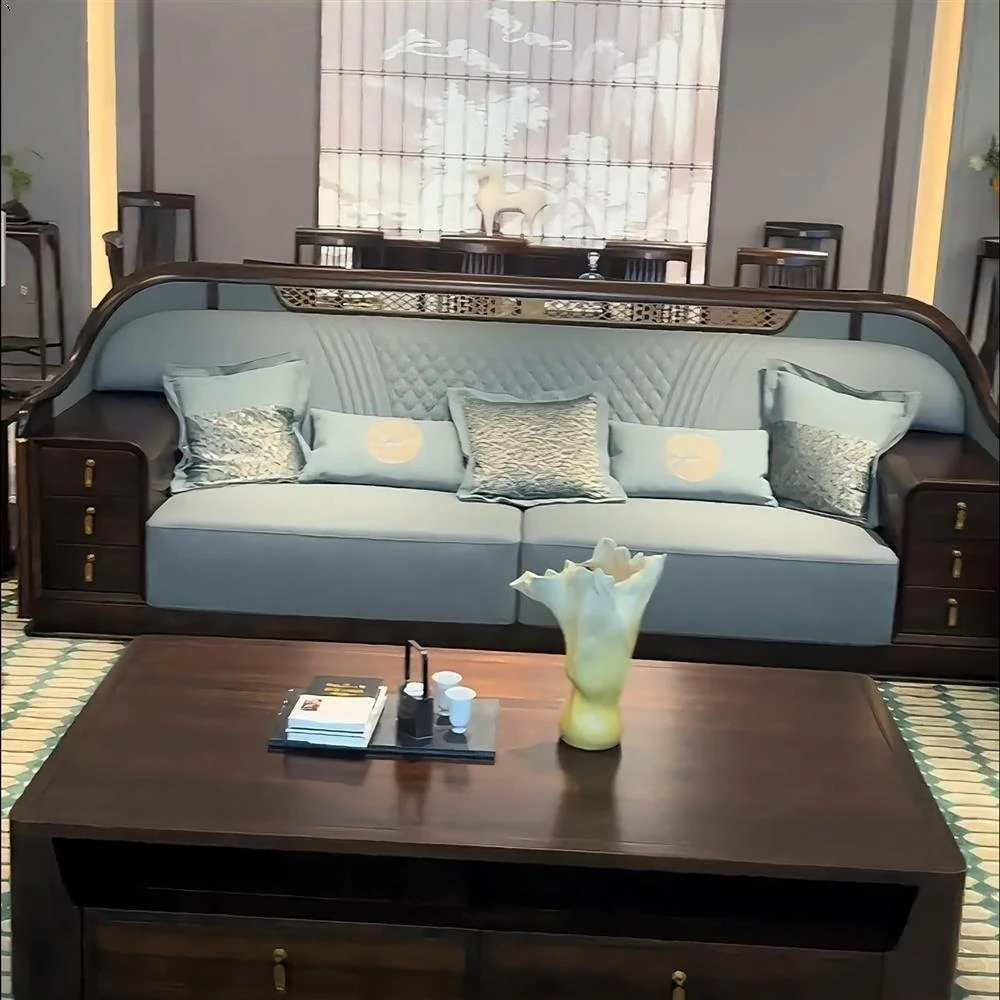 New Chinese Style Luxury Solid Wood Sofa with Genuine Leather - Elegant Modular Furniture for Villas and Apartments, Perfect for High-End Living Rooms