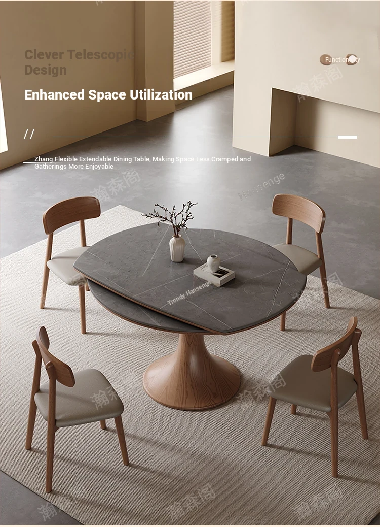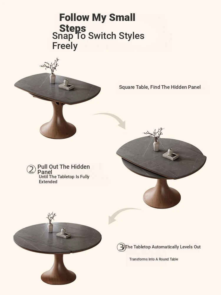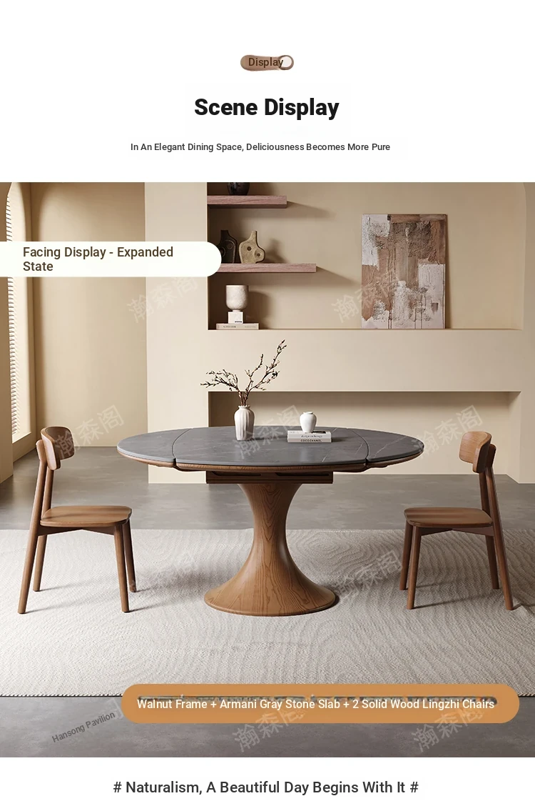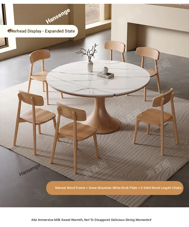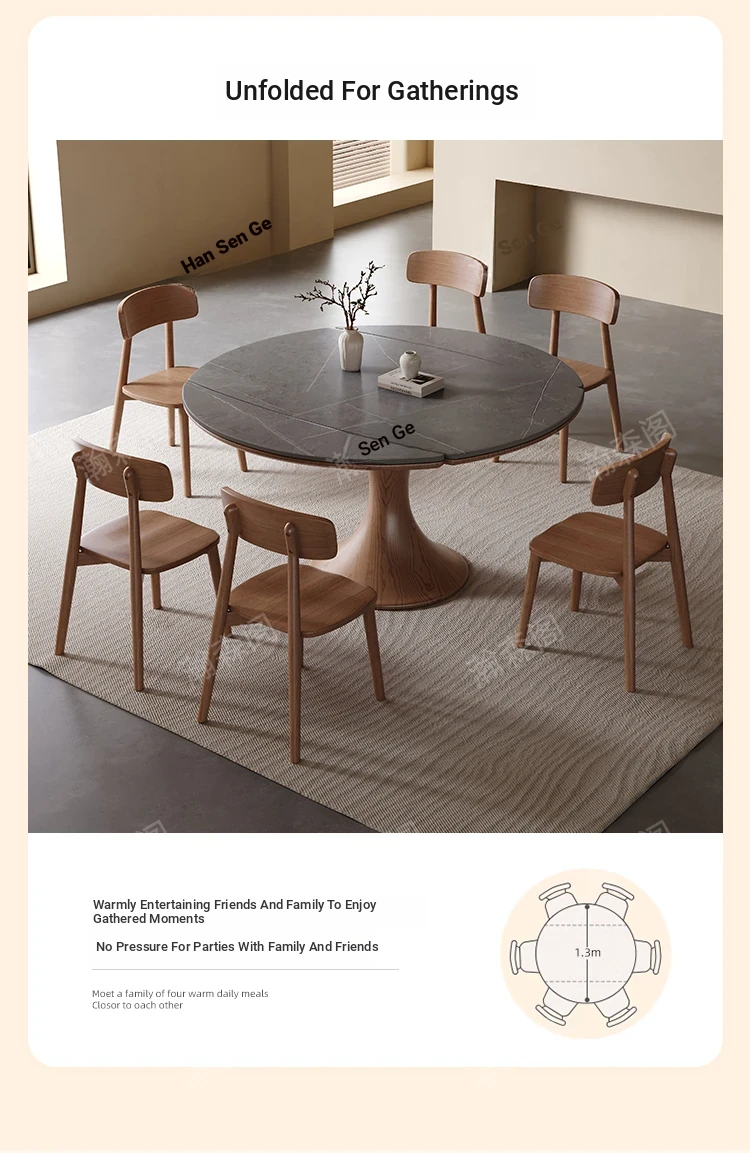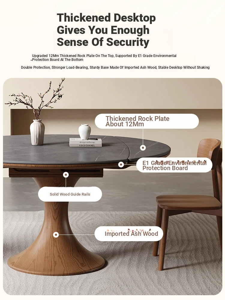 Vintage-Style Extendable Rock Slab Dining Table - Space-Saving Foldable Solid Wood Table for Small Homes, Versatile Square and Round Design in Ash Wood