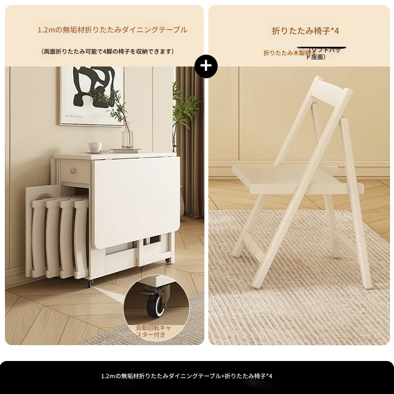 折りたたみテーブル(木製タイプ)-組み立て不要エコ版-正方形120cmクリームホワイト+ダイニングチェア*4 ❤️注文すると100元のキャッシュバック