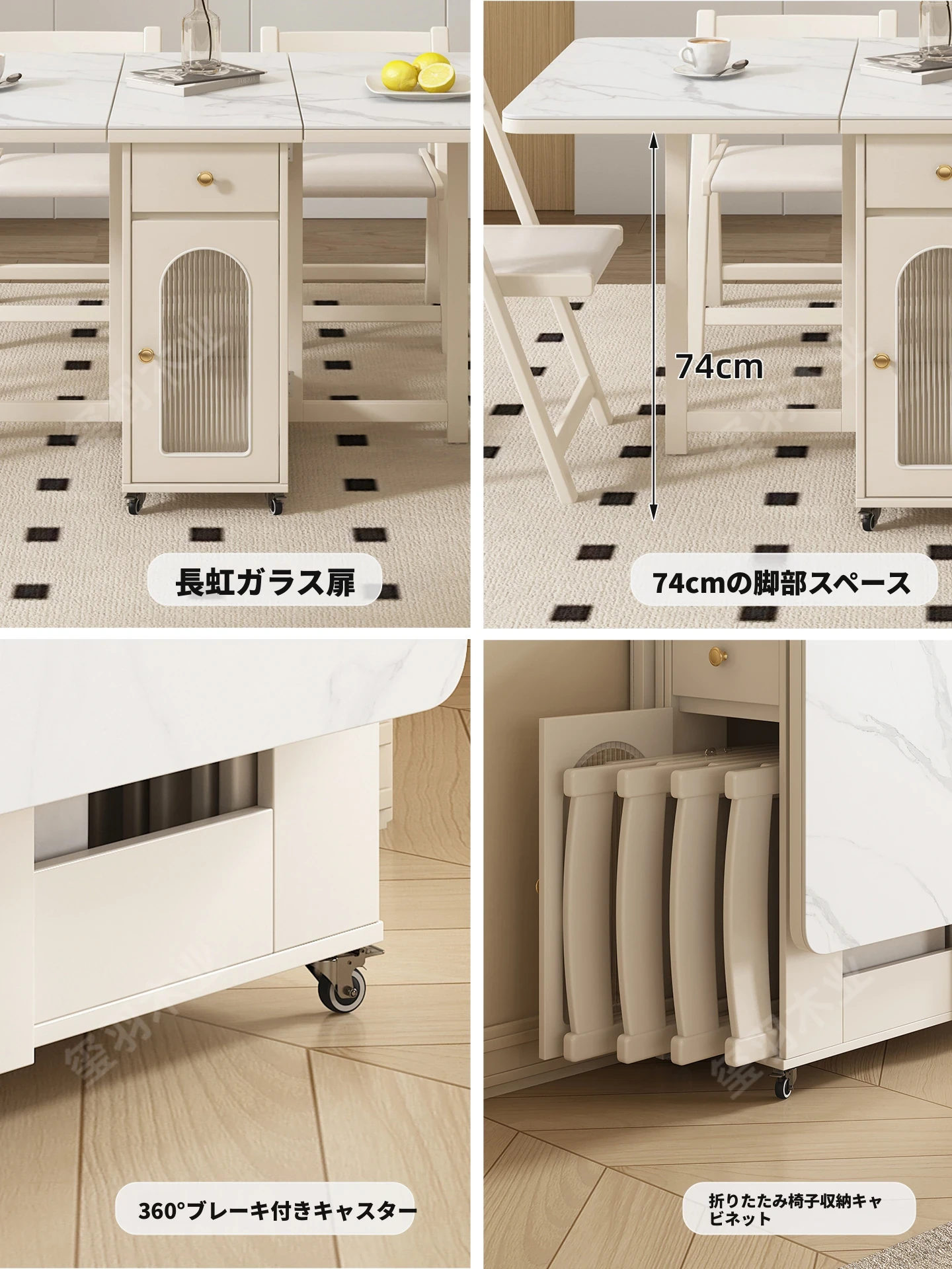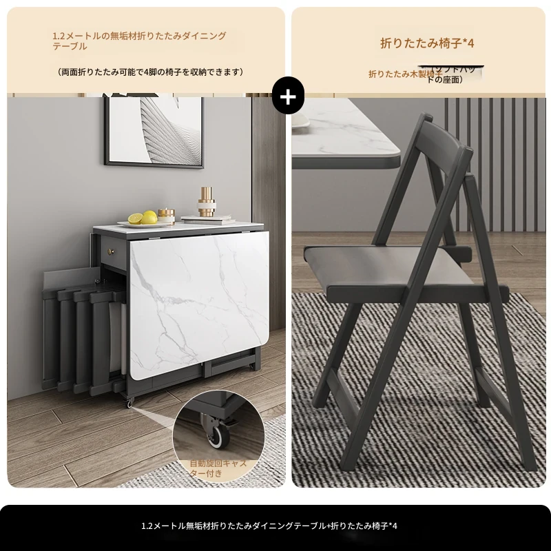 折りたたみテーブル(岩板タイプ)-組み立て不要エコ版-正方形150cmクリームホワイト+ダイニングチェア*4 ❤️注文すると100元のキャッシュバック
