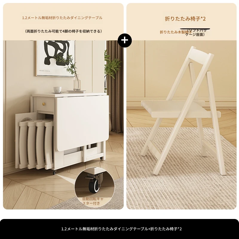折りたたみテーブル(木製タイプ)-組み立て不要エコ版-正方形120cmクリームホワイト+ダイニングチェア*2 ❤️注文すると50元のキャッシュバック