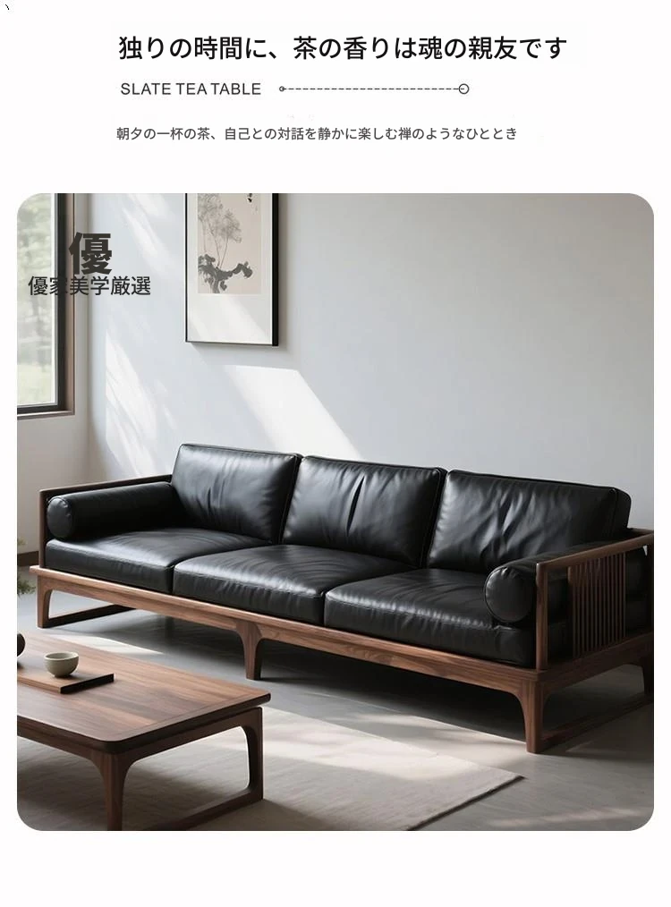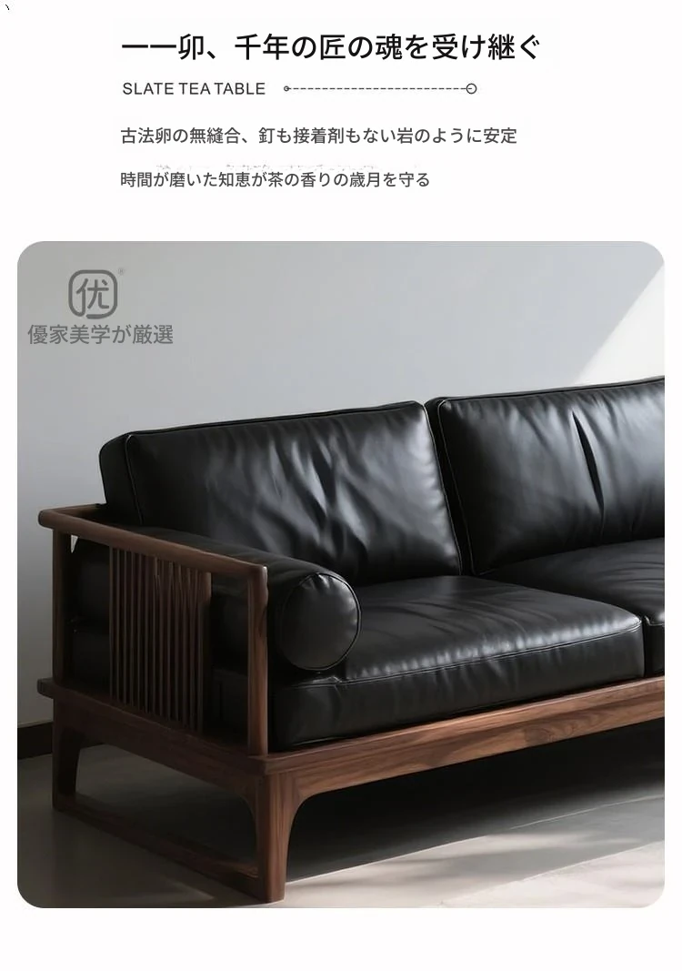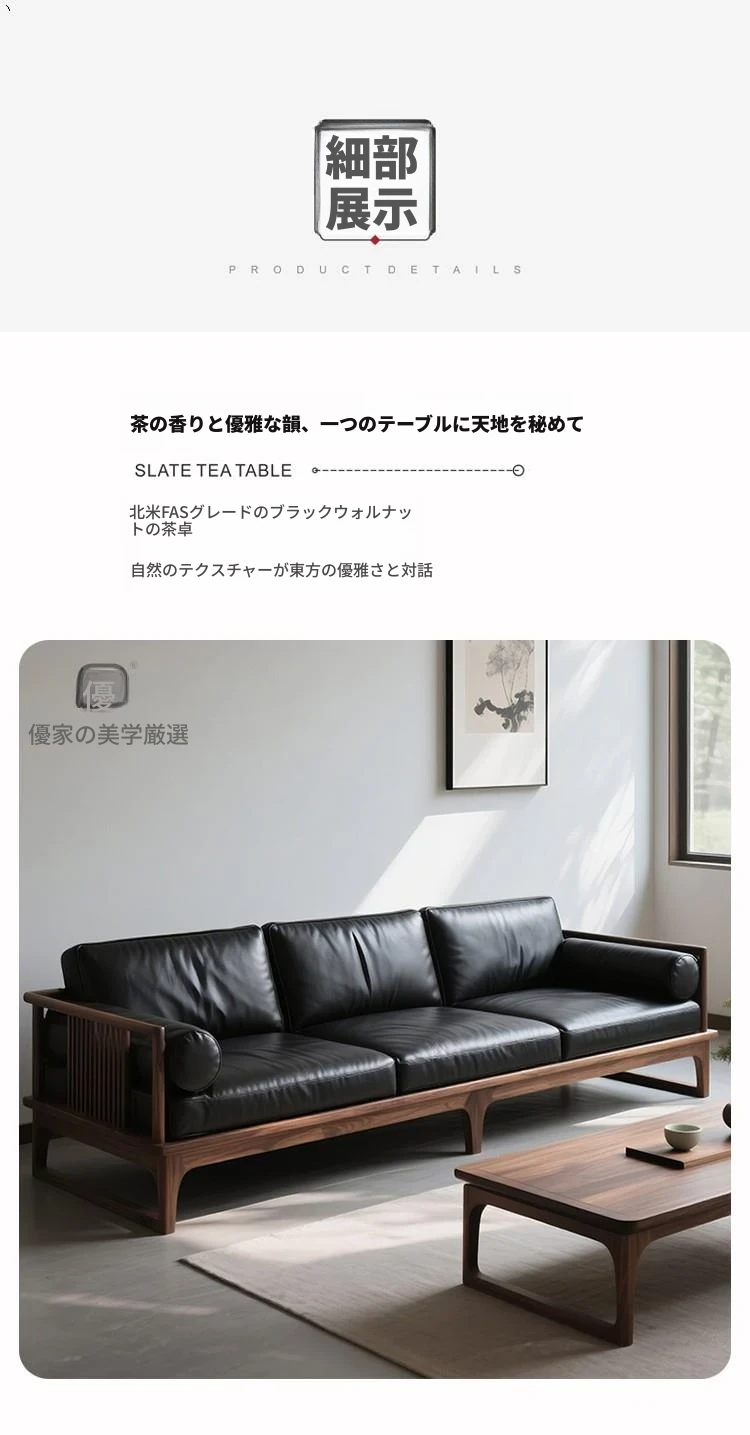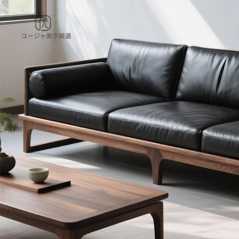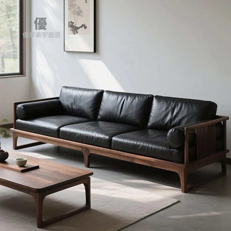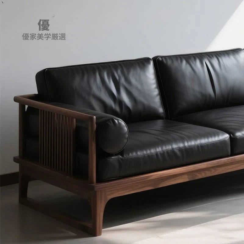 2025新作!新中式デザインの北米産ブラックウォールナットソファ - 直線的なスタイルの3人掛けレザー仕上げ、全て無垢材使用!高級感溢れるリビング空間を演出します。