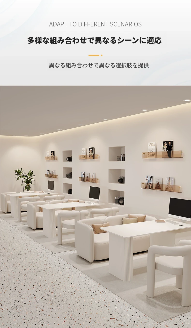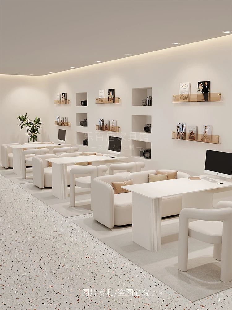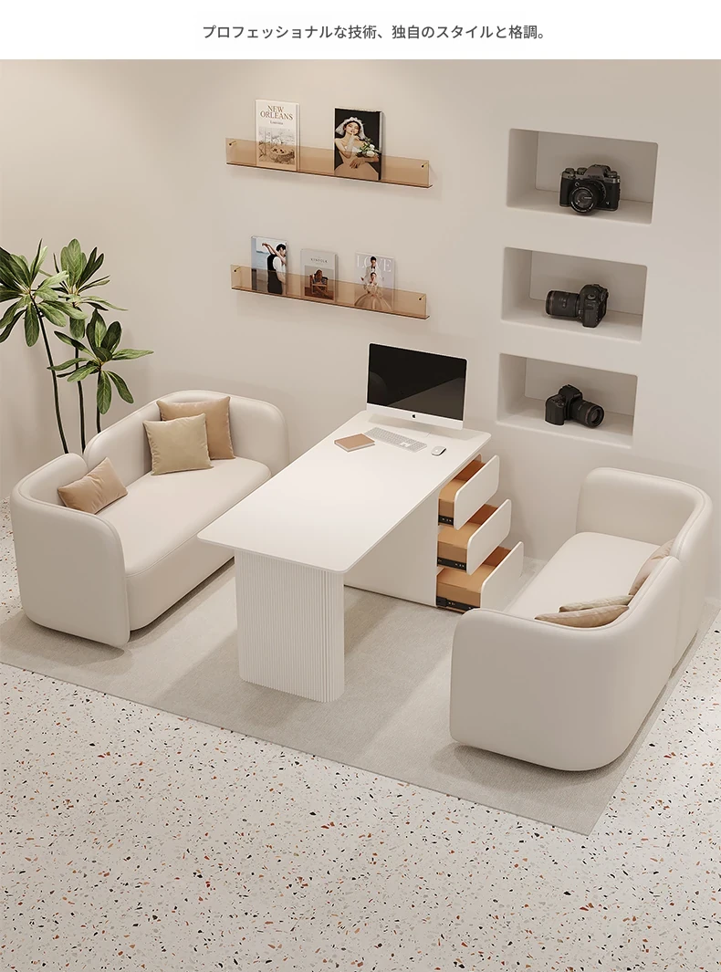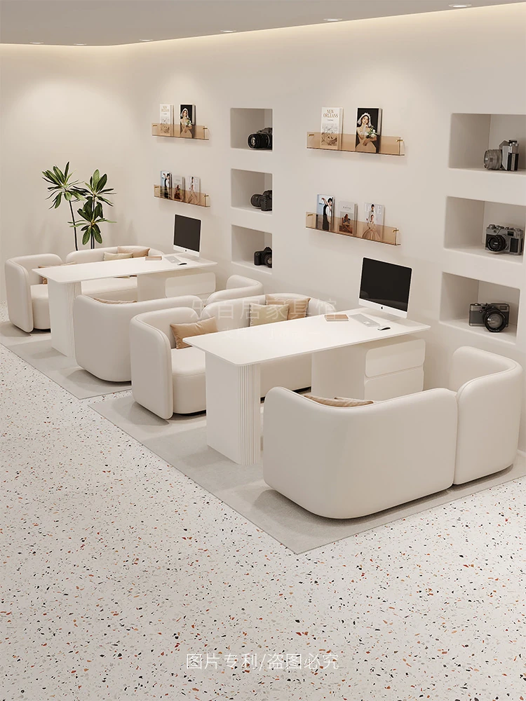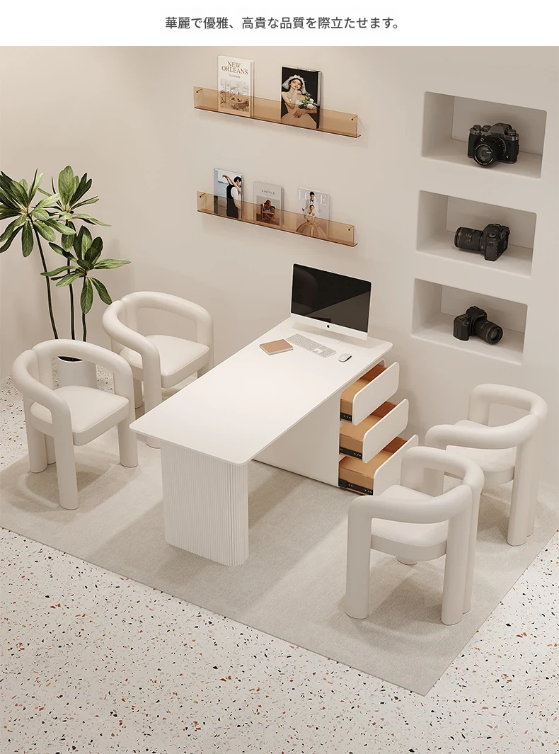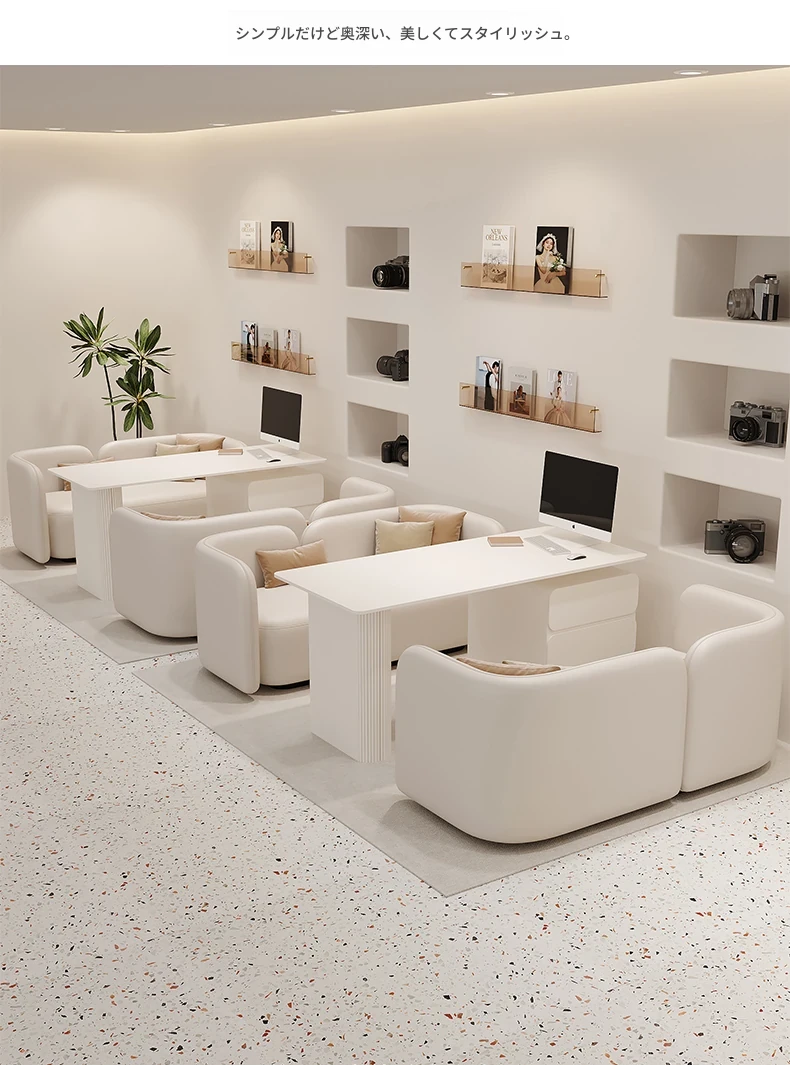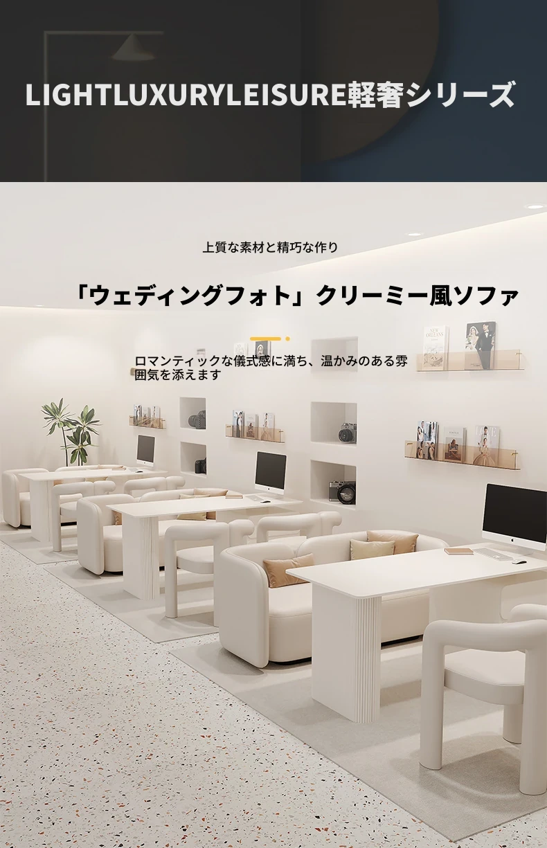 クリーム風のウェディングドレス店専用、美容院に最適な談話テーブル&椅子セット!引き出し付きで便利なリラックススペース、接客エリアにぴったりのソファブース!おしゃれで快適な空間を演出します。