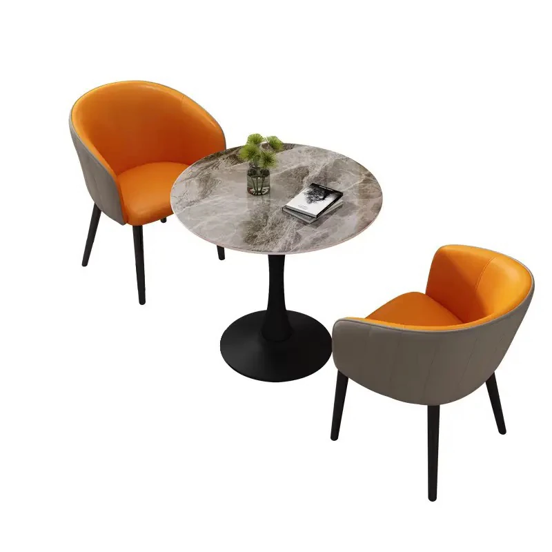 80センチ岩板細脚テーブル 外灰 内オレンジ椅子 11テーブル2椅子