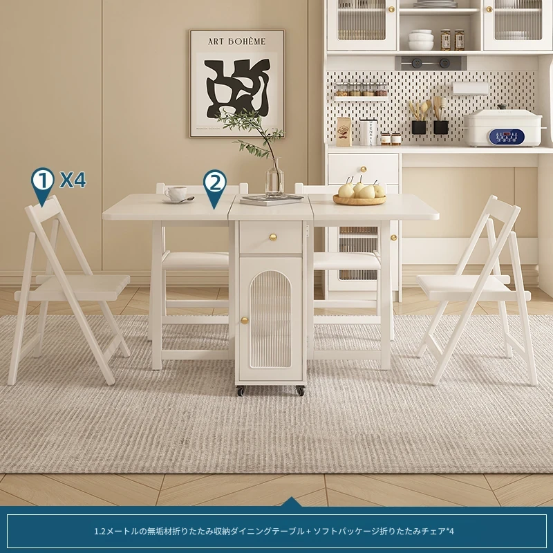 1.2メートル折りたたみ無垢材ダイニングテーブル >>4脚の椅子を収納可能