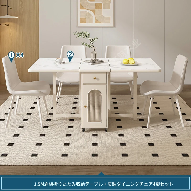 1.5メートル折りたたみダイニングテーブル+皮椅子*4(抗菌岩板+無垢材質) ⭐先着10名様に100元現金クーポン返金