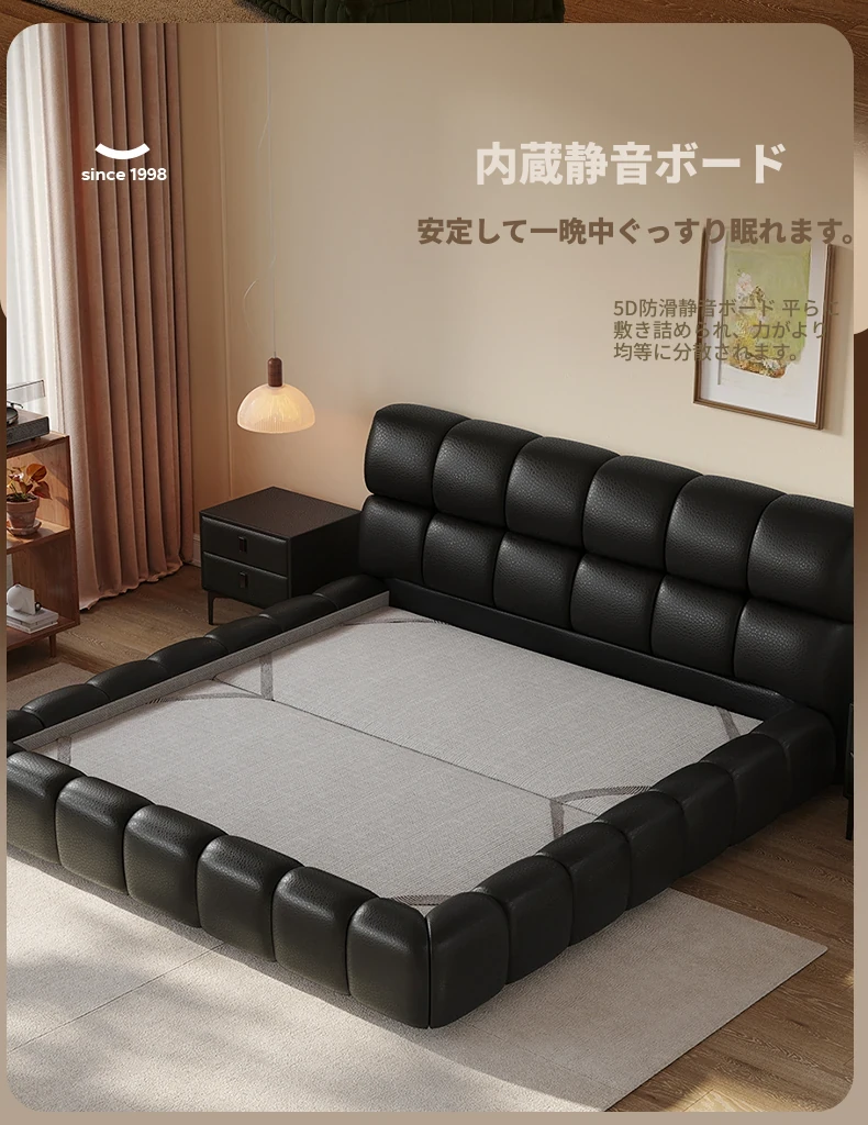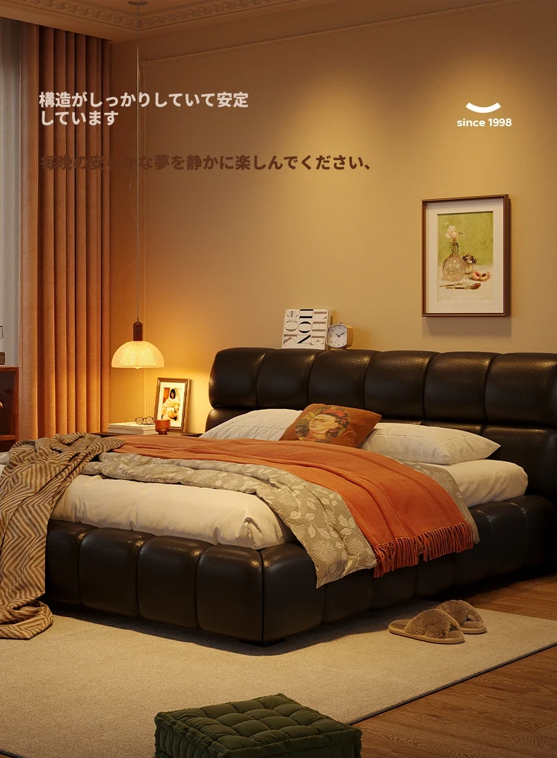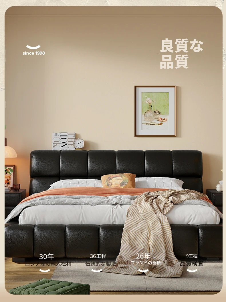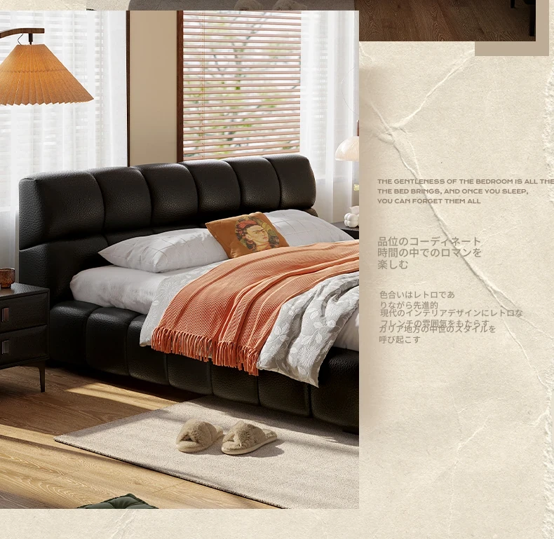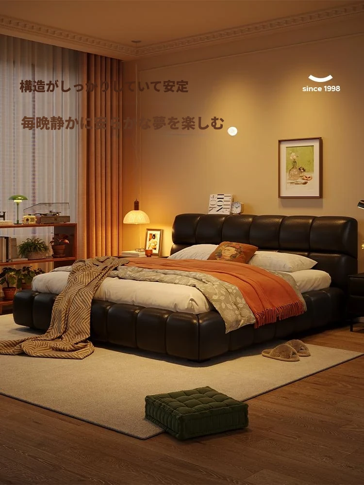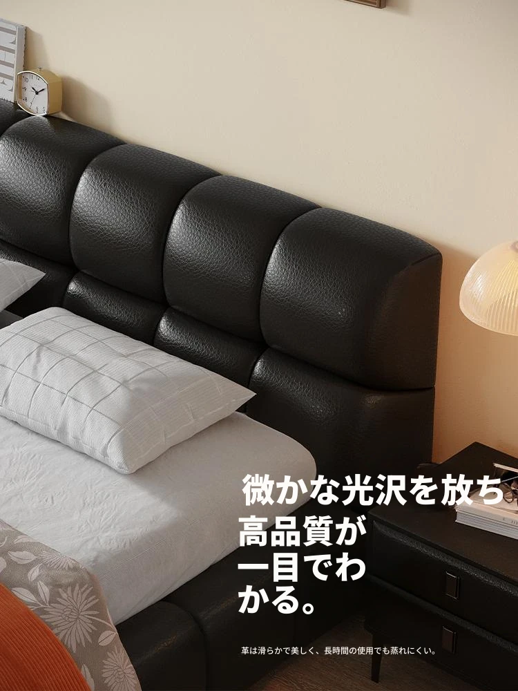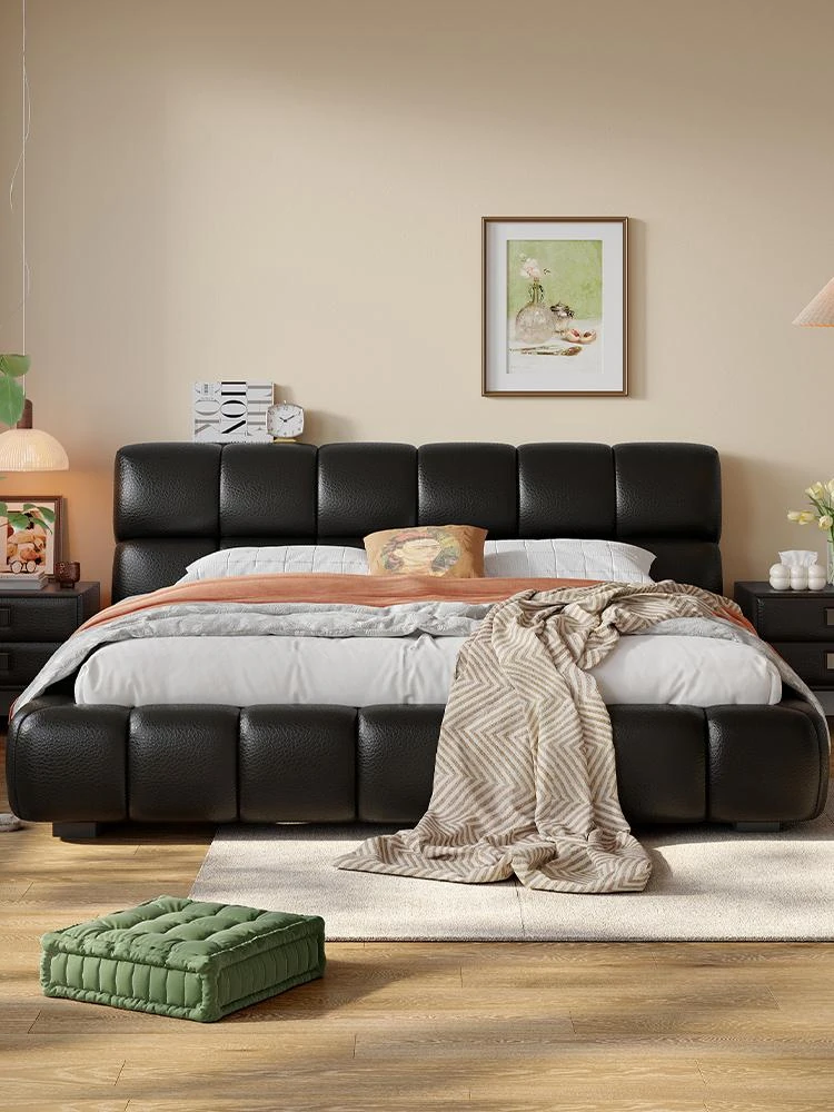 ラウンドスタイル イタリアンミニマリスト 本革使用 ダブルベッド ブラックソフトパッド 2025年新作 高級感あふれる主寝室用ベッド
