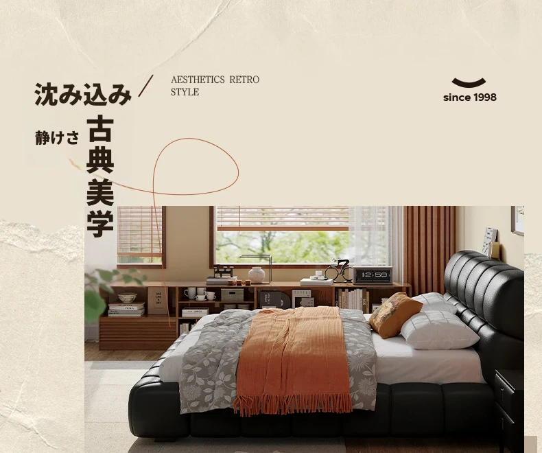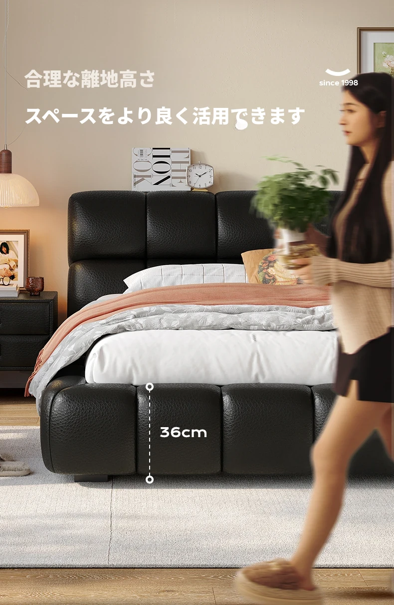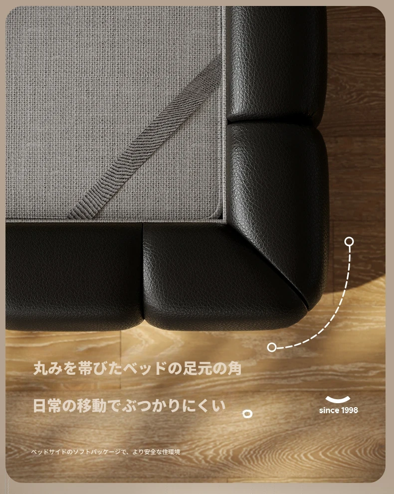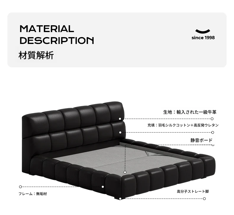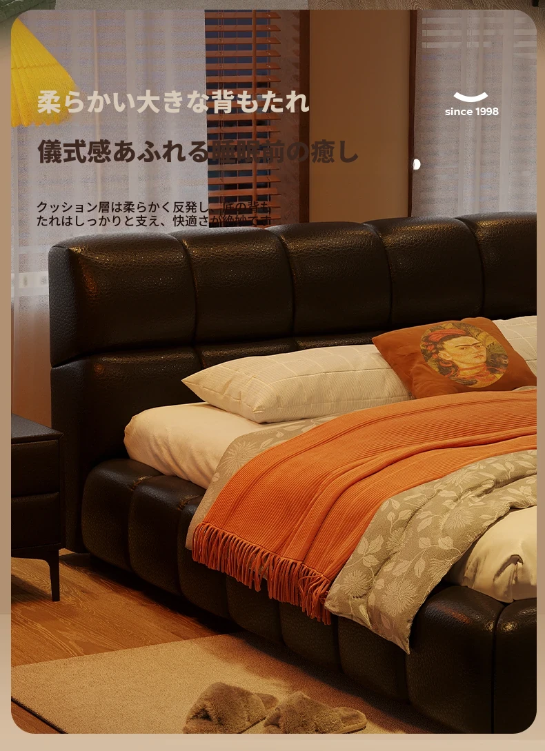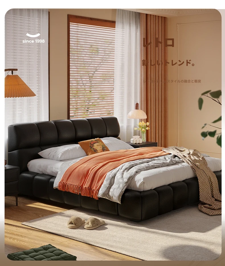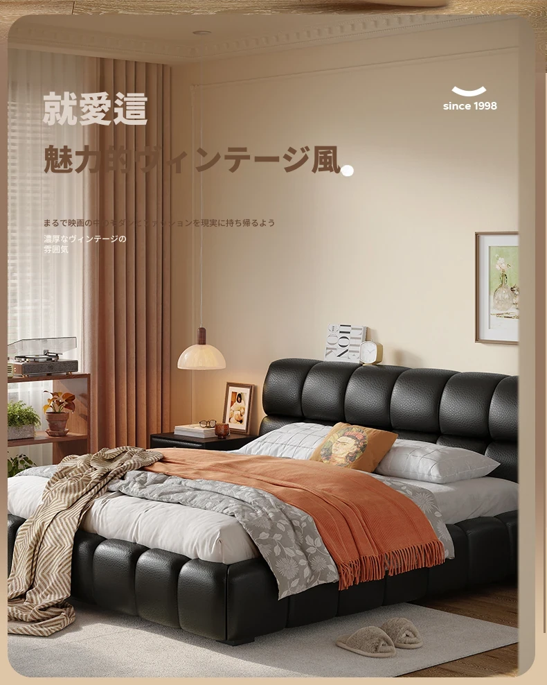 ラウンドスタイル イタリアンミニマリスト 本革使用 ダブルベッド ブラックソフトパッド 2025年新作 高級感あふれる主寝室用ベッド