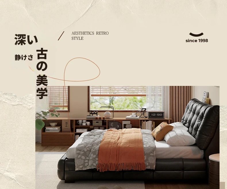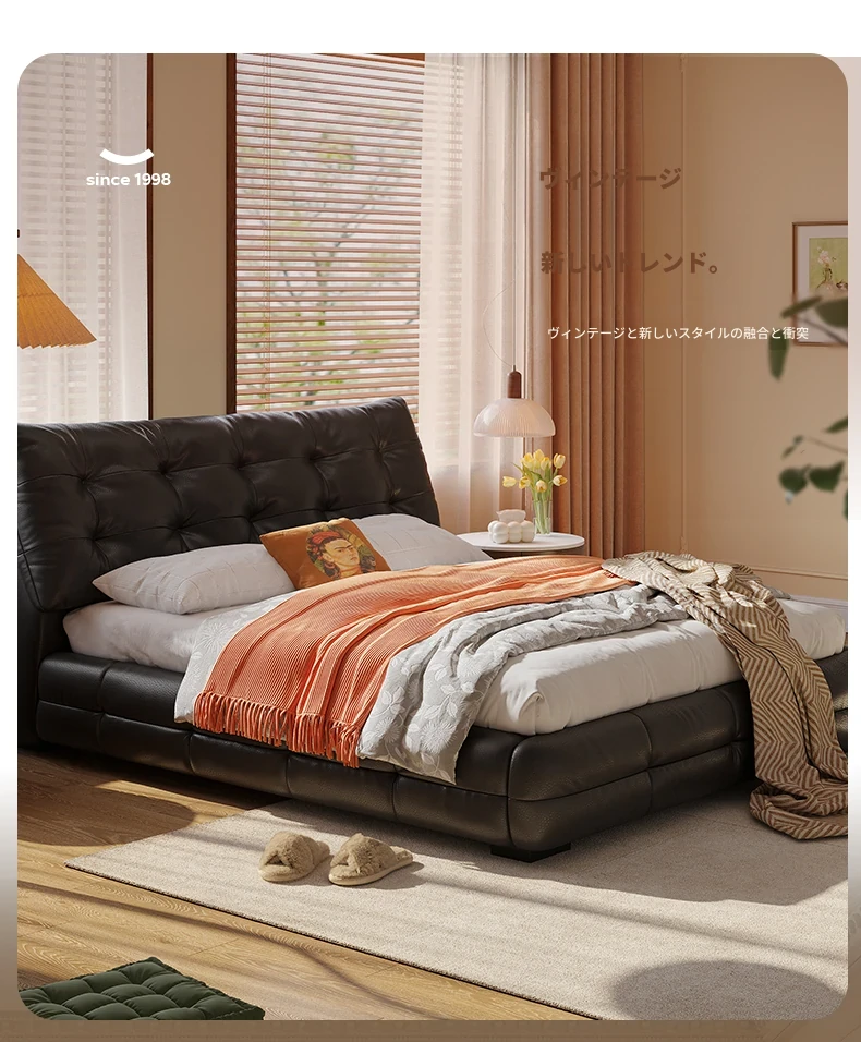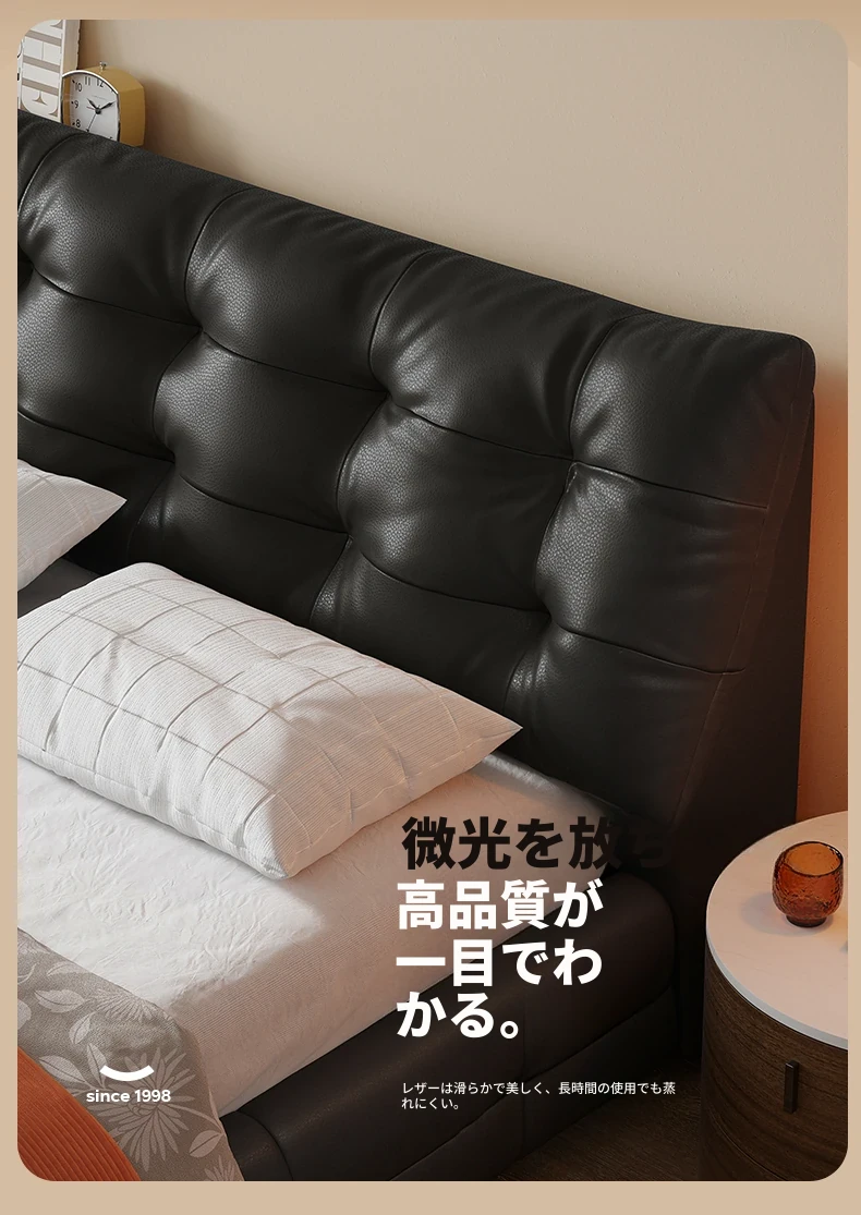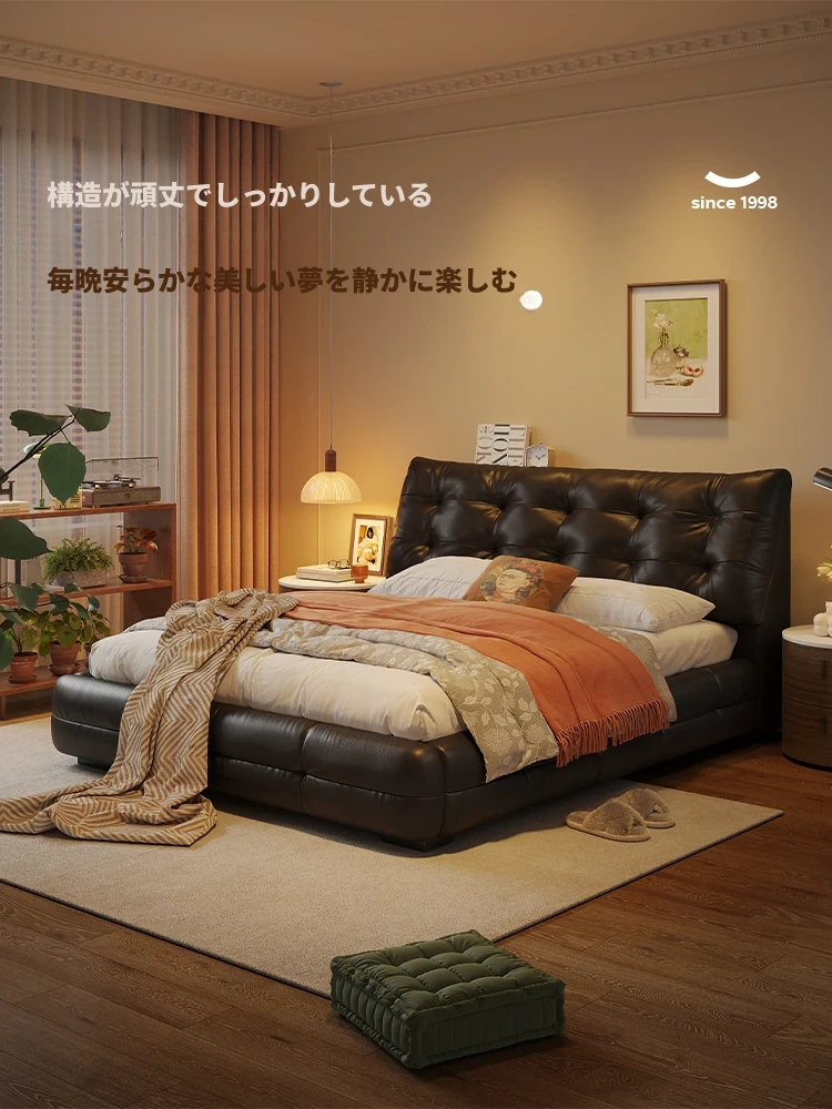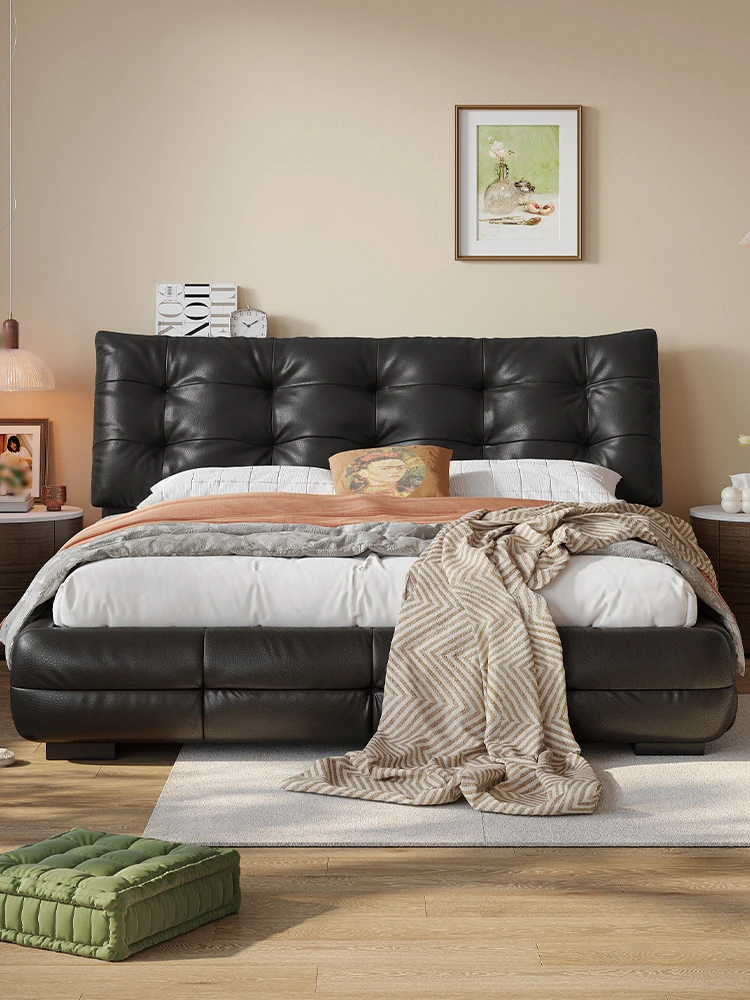 ラグジュアリーなレザー仕上げ!高級フレンチスタイルの本革ダブルベッド - シックなブラックのソフトパッケージで、主寝室にぴったりのエレガントで贅沢な雰囲気を演出します。