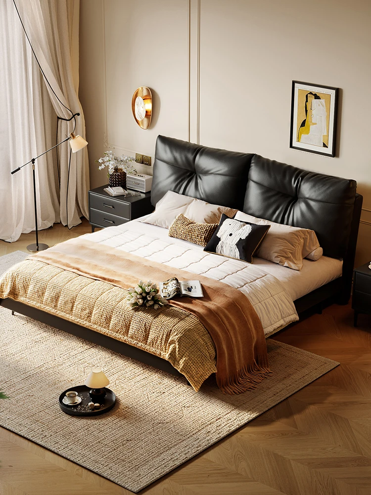 ラウンドウェーブ海の波本革ベッド|イタリアンミニマリズム・ラグジュアリー|トップレイヤー牛革使用|主寝室に最適なダブルベッド|ブラックハイレッグデザイン|贅沢な快適さをあなたの寝室に!