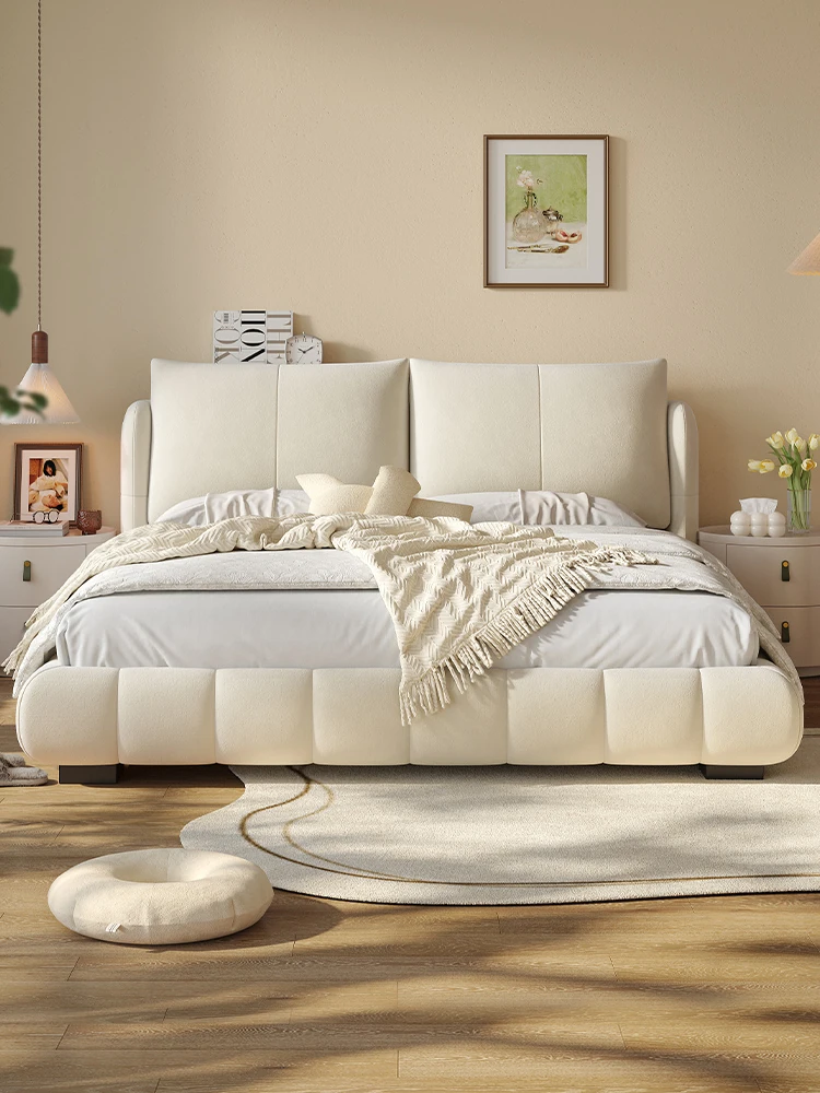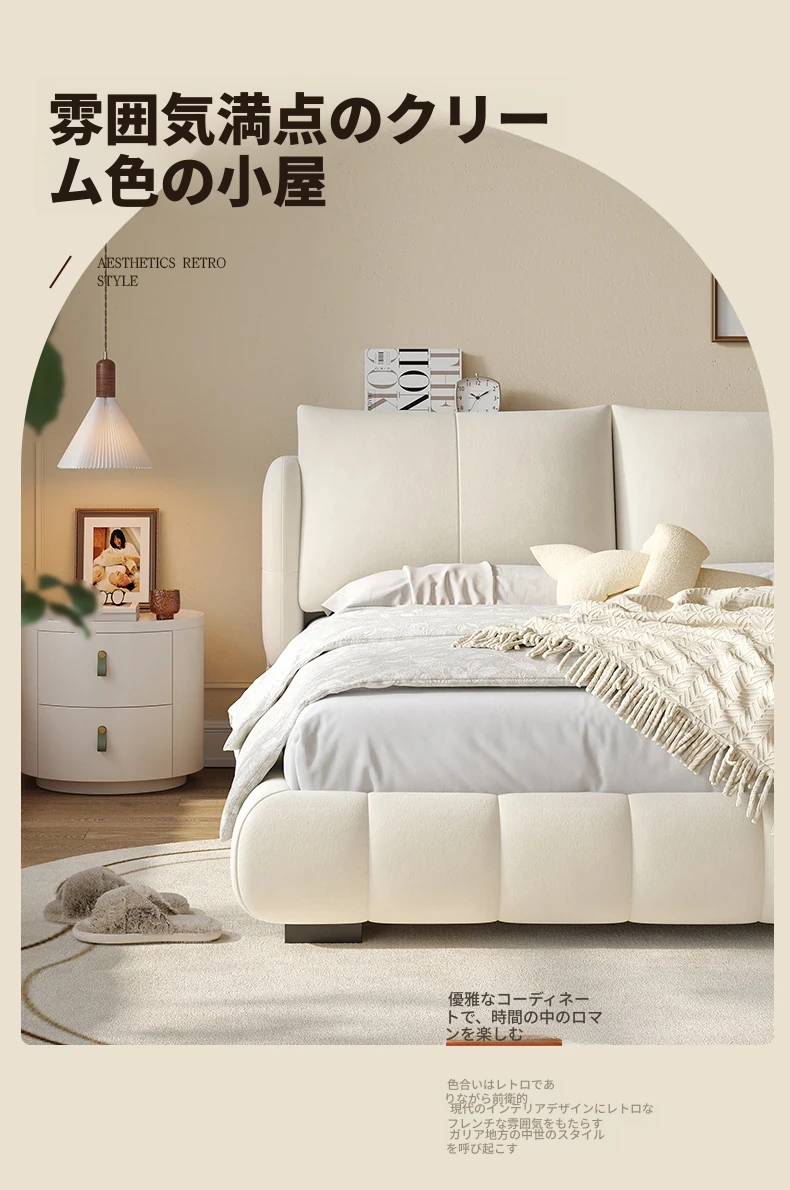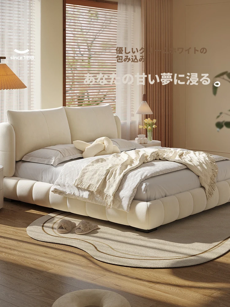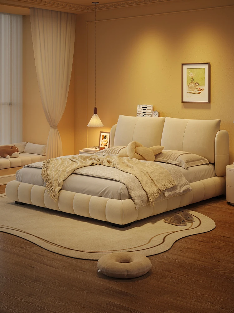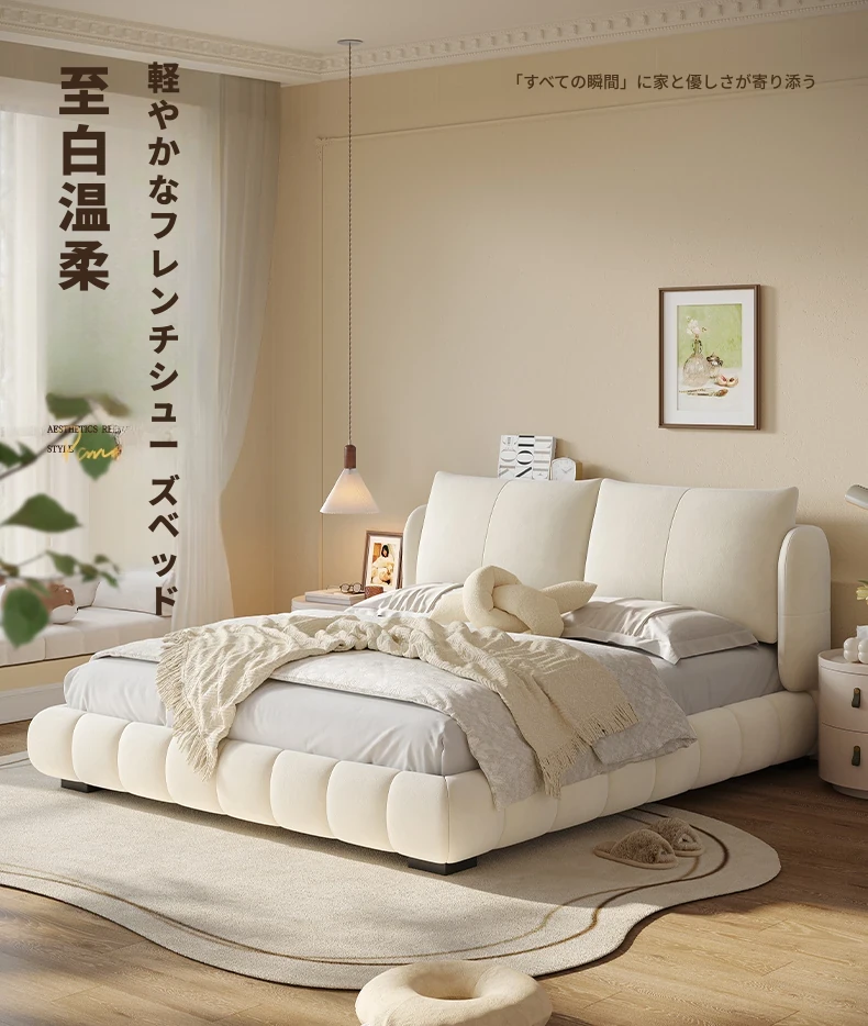 ラウンドフレンチスタイルのシフォンパフベッド | 上質なマット生地とサンドブラストベルベット | 女性向け主寝室にぴったりな高級フロア低ベッド | ダブルサイズで贅沢な安らぎをお届けします!