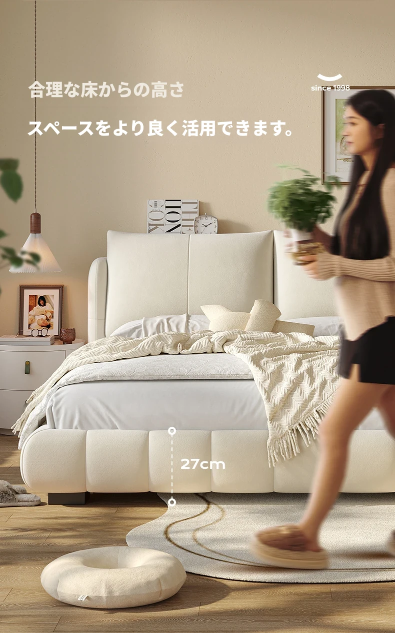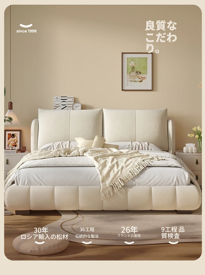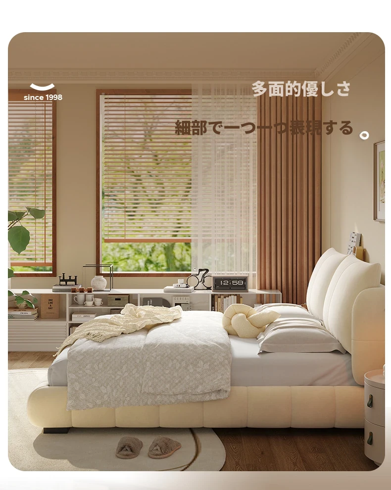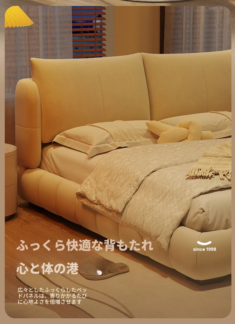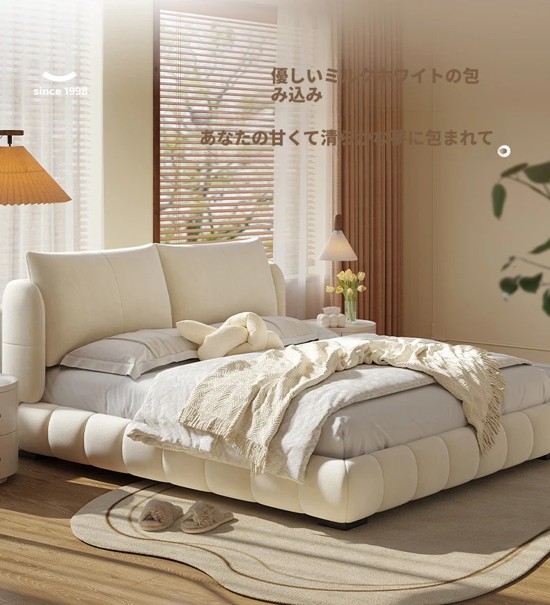 ラウンドフレンチスタイルのシフォンパフベッド | 上質なマット生地とサンドブラストベルベット | 女性向け主寝室にぴったりな高級フロア低ベッド | ダブルサイズで贅沢な安らぎをお届けします!