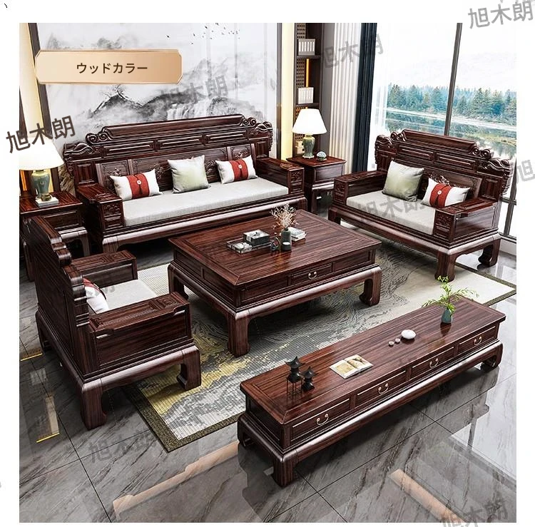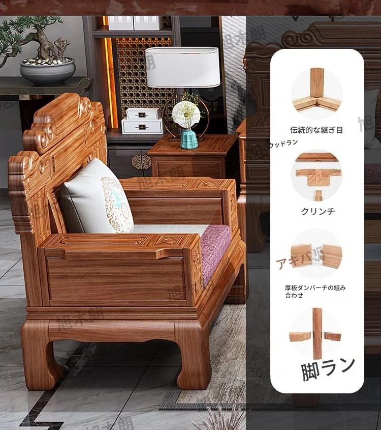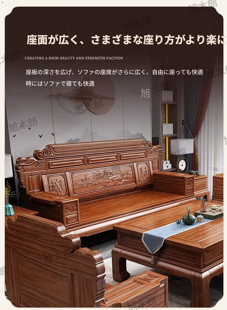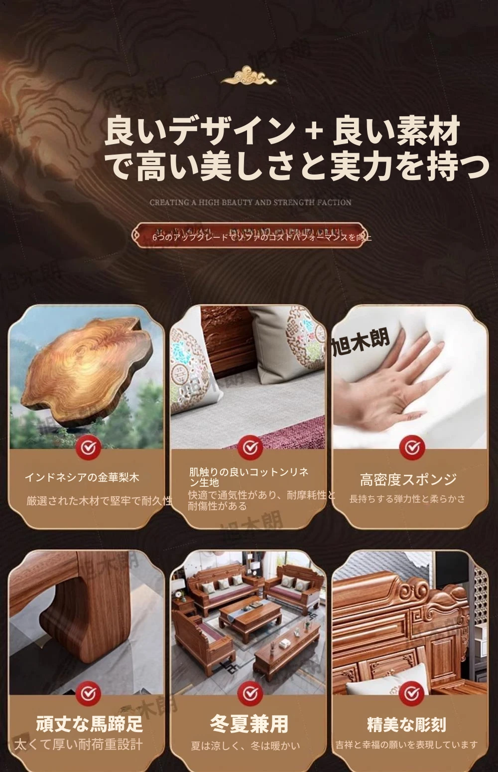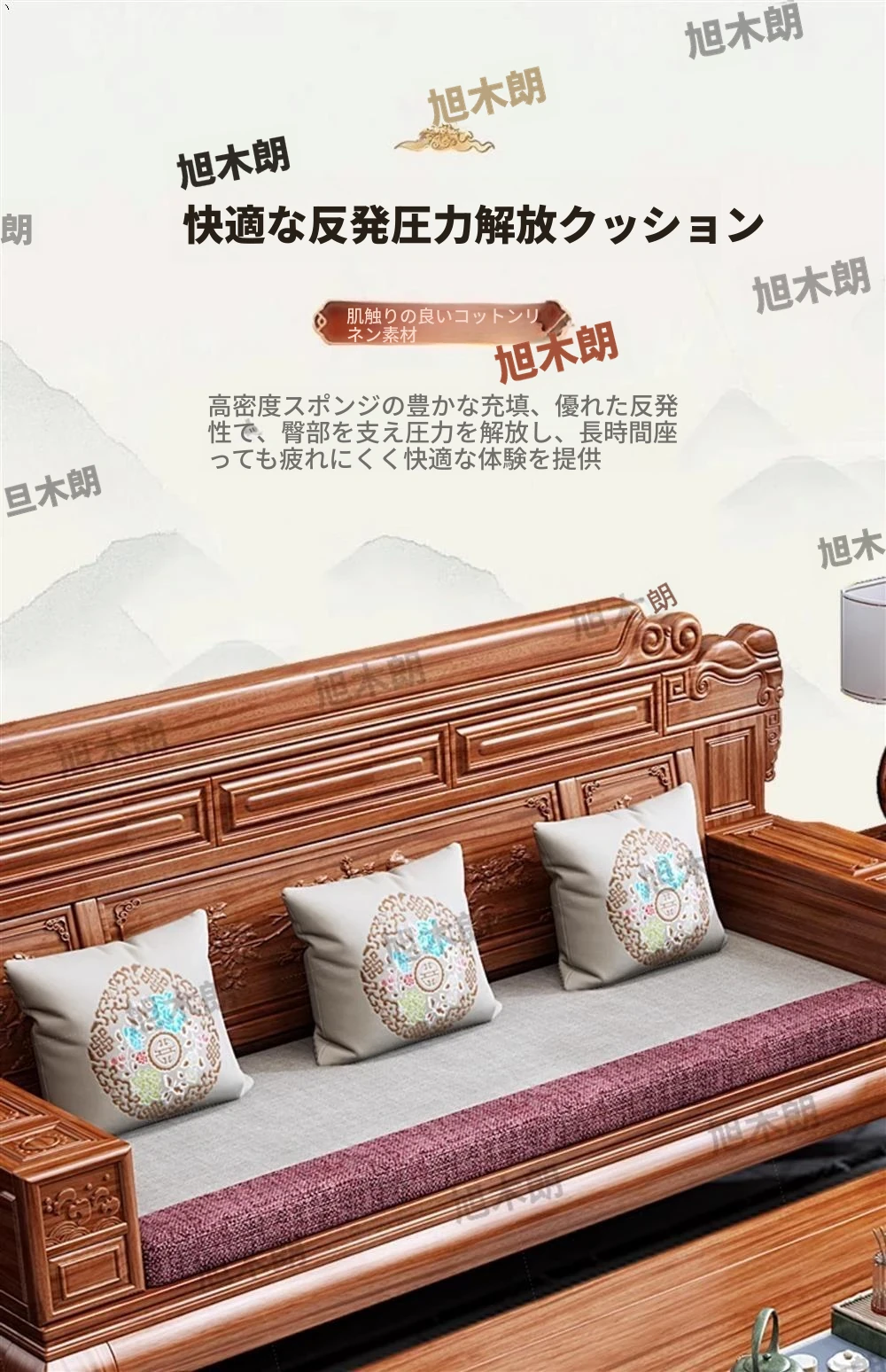 高級感溢れる中式金花梨実木ソファセット - 冬夏両用、古典彫刻デザインの大容量リビング向け。贅沢な赤木の美しさで、あなたの客間を華やかに彩ります。