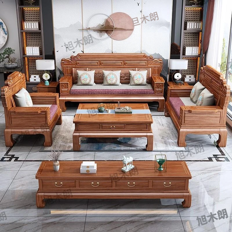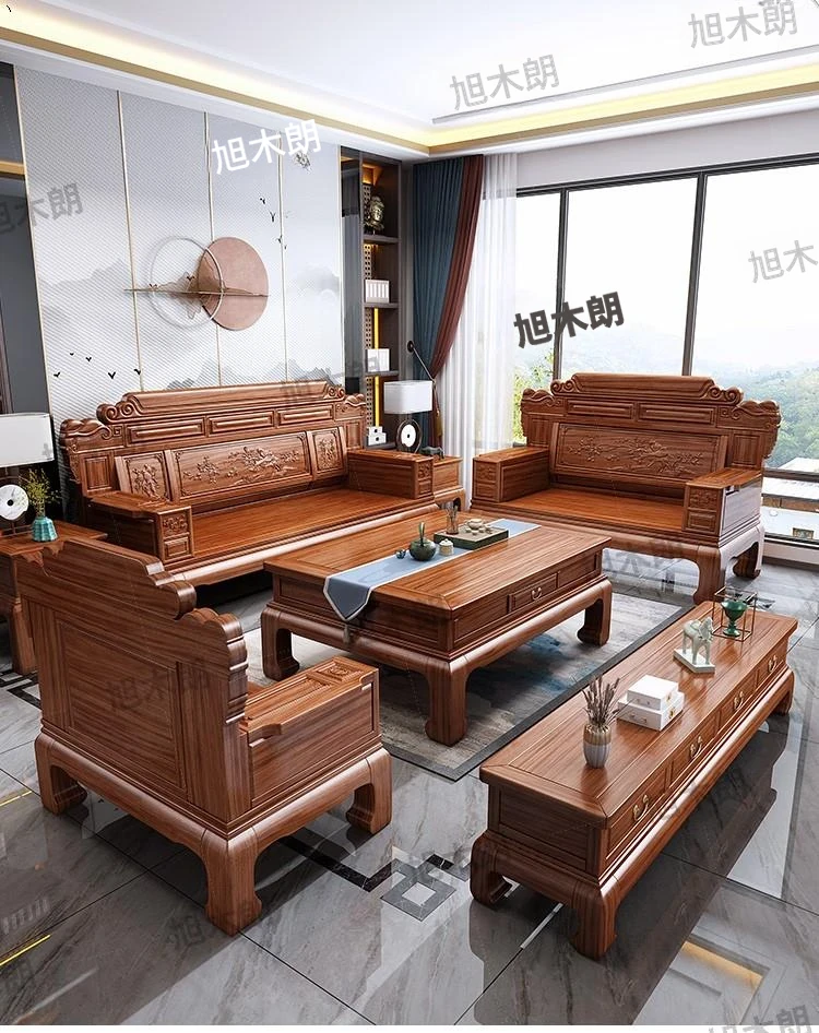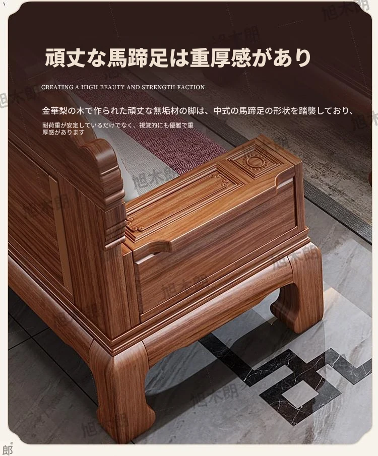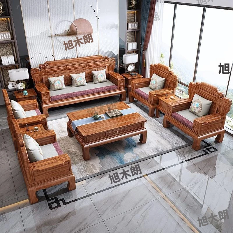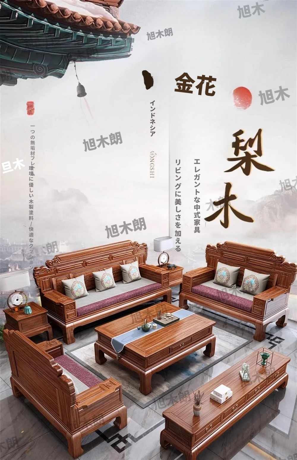 高級感溢れる中式金花梨実木ソファセット - 冬夏両用、古典彫刻デザインの大容量リビング向け。贅沢な赤木の美しさで、あなたの客間を華やかに彩ります。