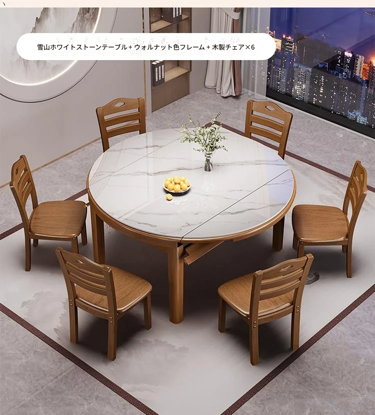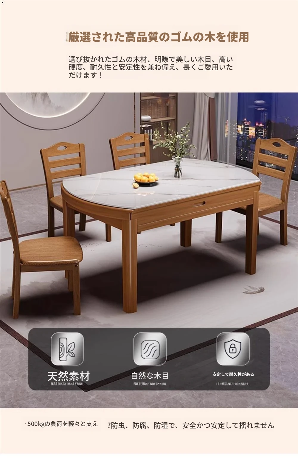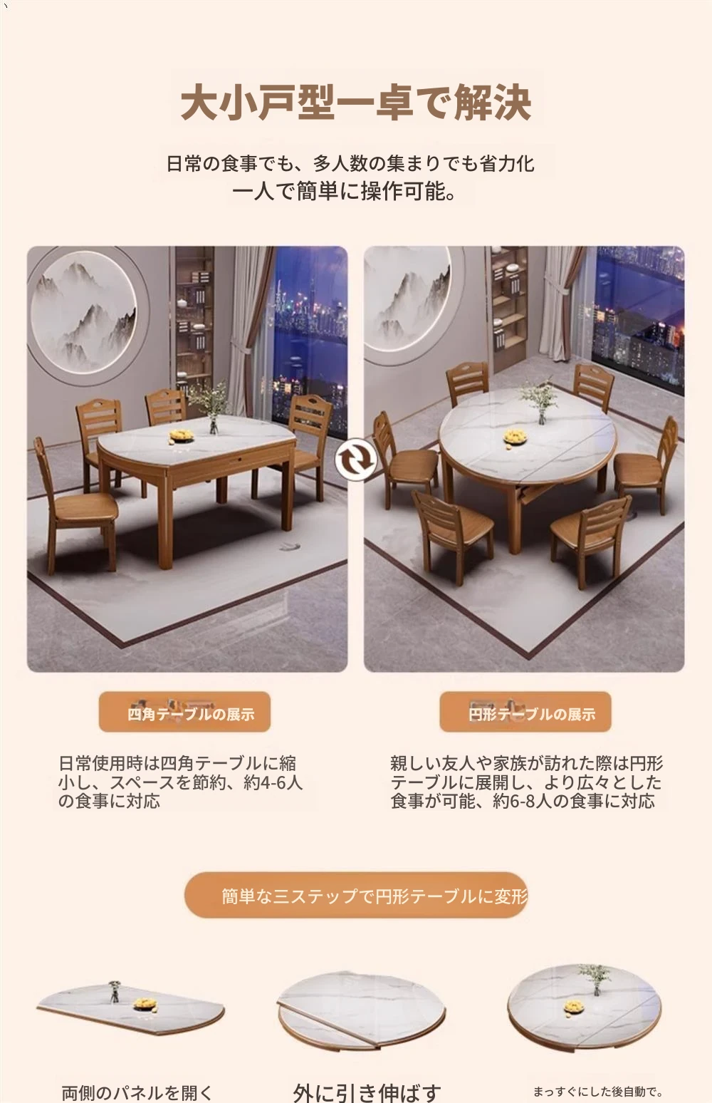 天然木材使用!モダンでシンプルな折りたたみ式ダイニングテーブルセット - 長方形から丸型に変形可能、家庭にぴったりの実用的な食事用テーブル。