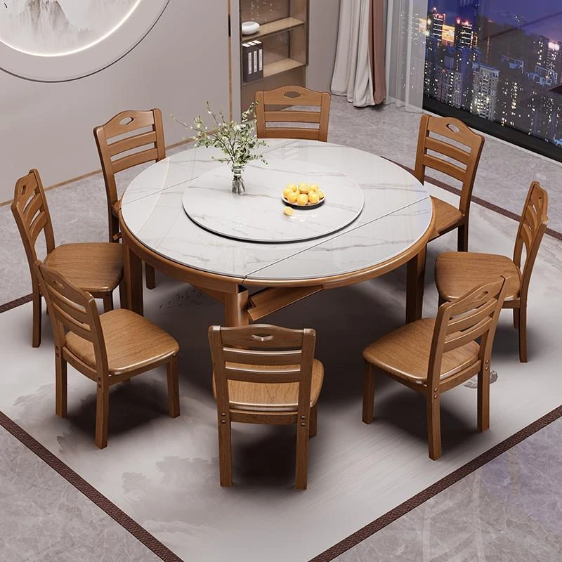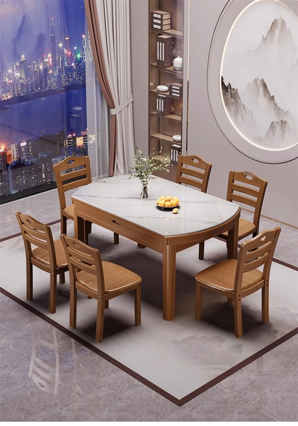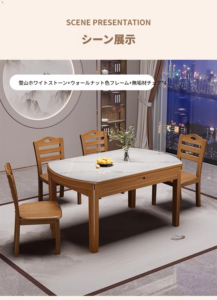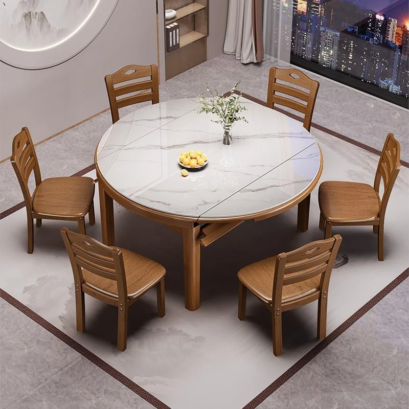 天然木材使用!モダンでシンプルな折りたたみ式ダイニングテーブルセット - 長方形から丸型に変形可能、家庭にぴったりの実用的な食事用テーブル。