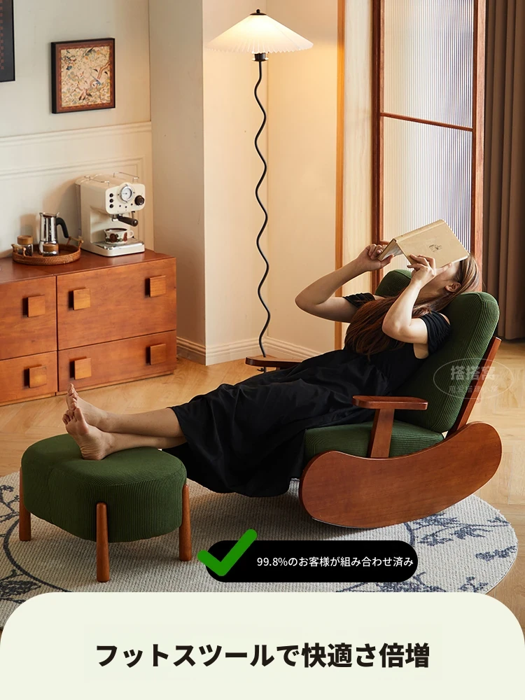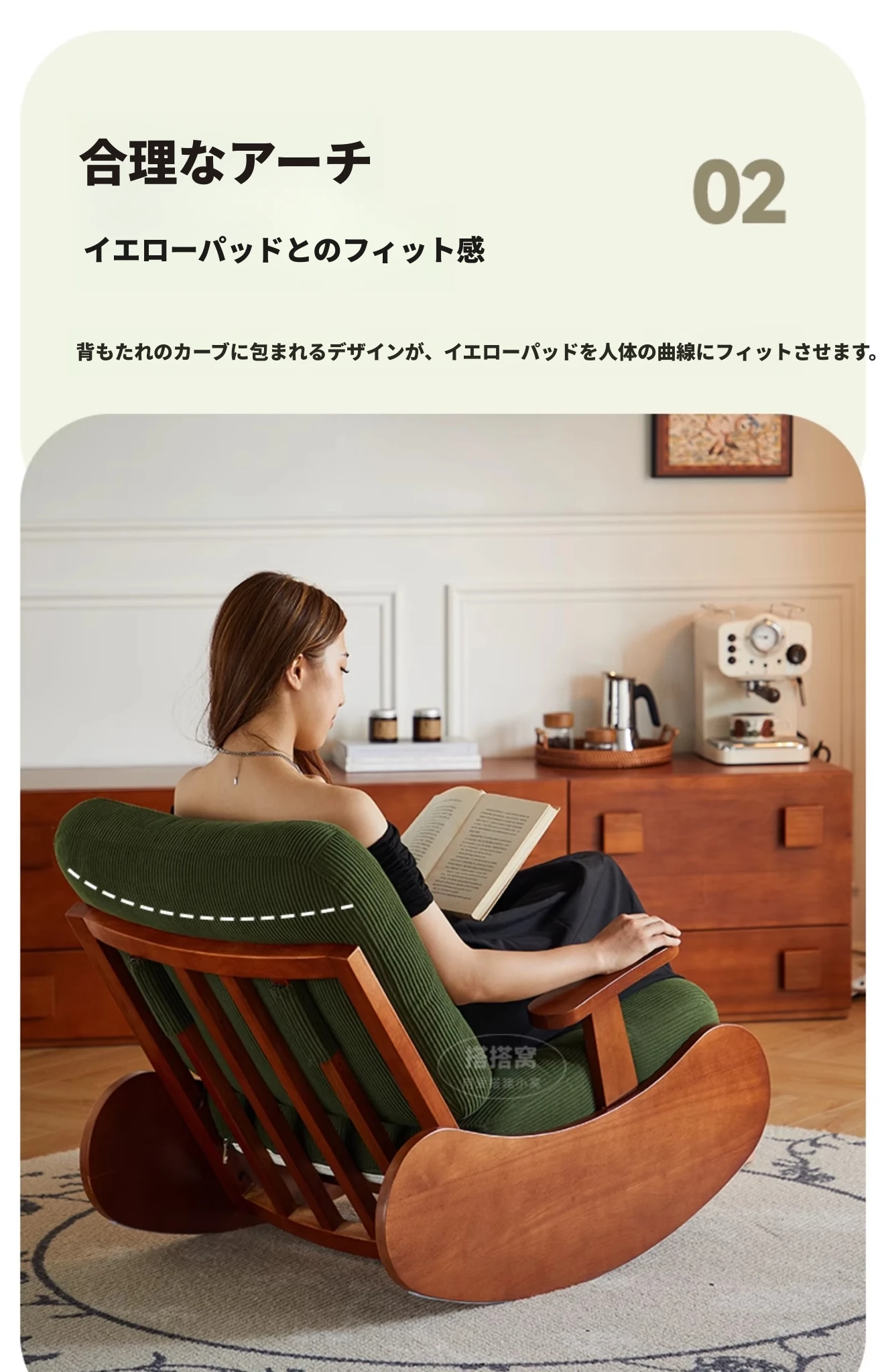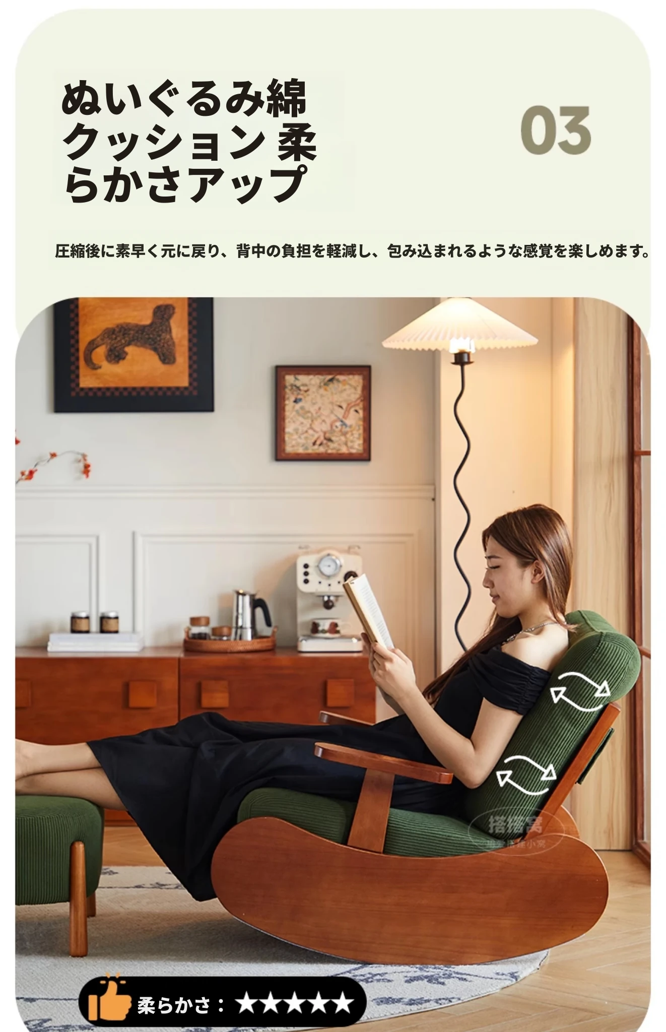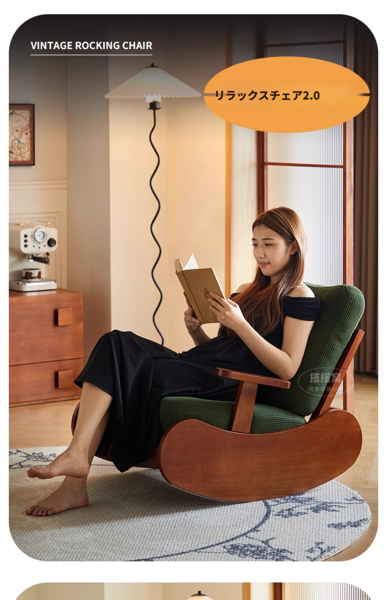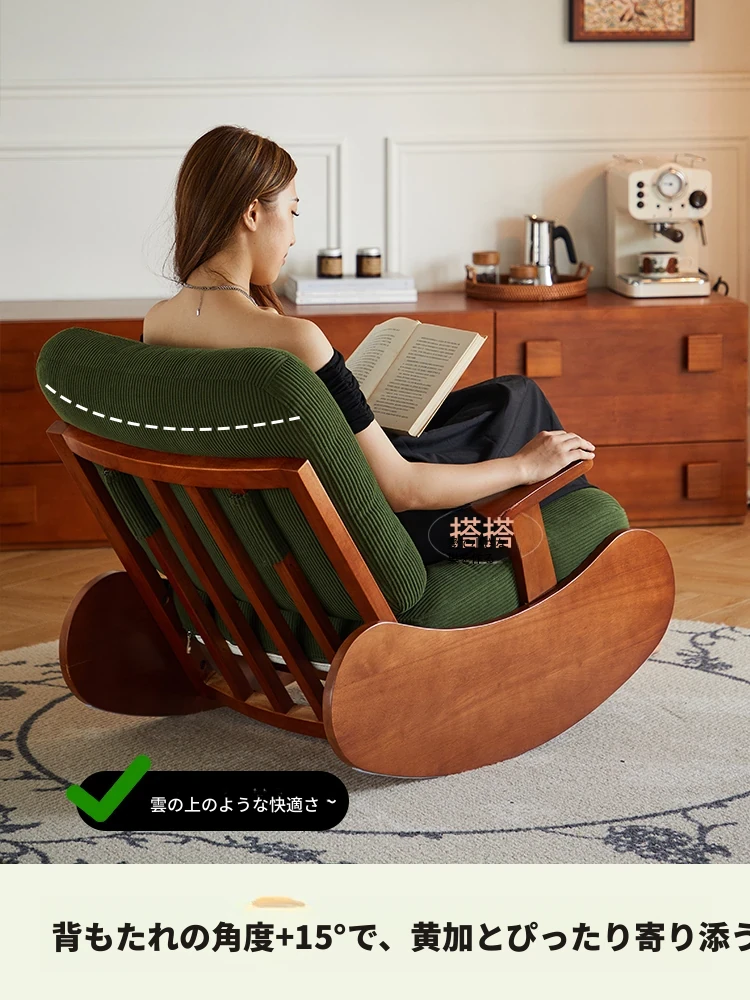 レトロな無垢材のリラックスソファ|家庭用・リビング・バルコニー・寝室に最適|寝転がれる・横になれる・おしゃれな洗える一人用ロッキングチェア|快適な休息のひとときをお届けします!