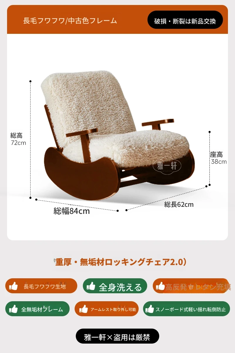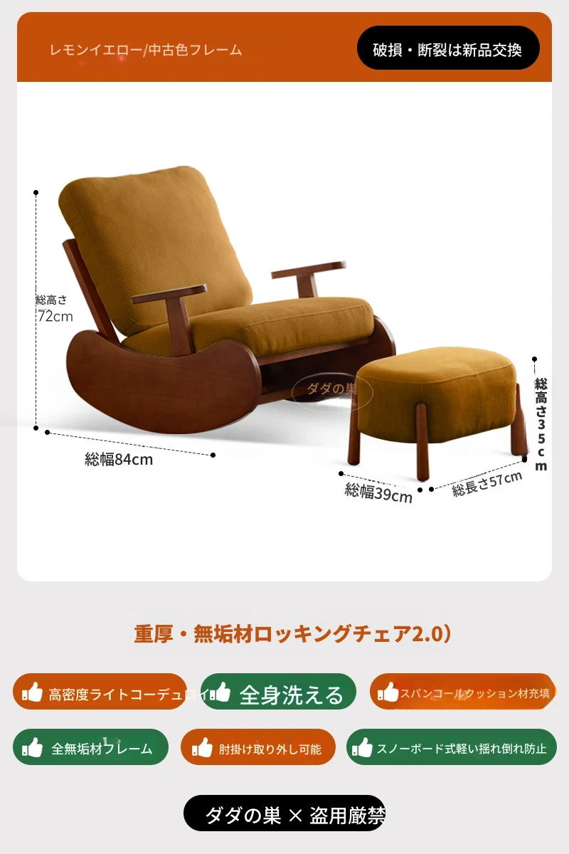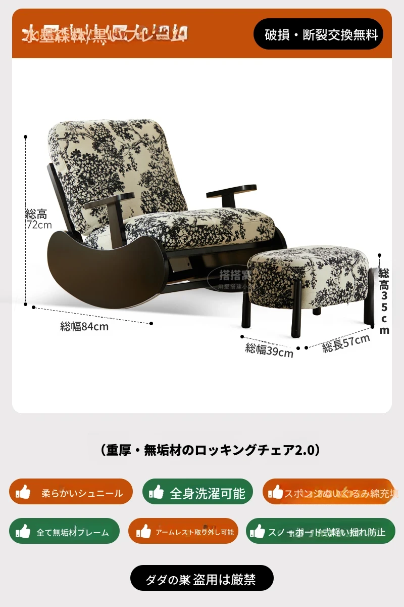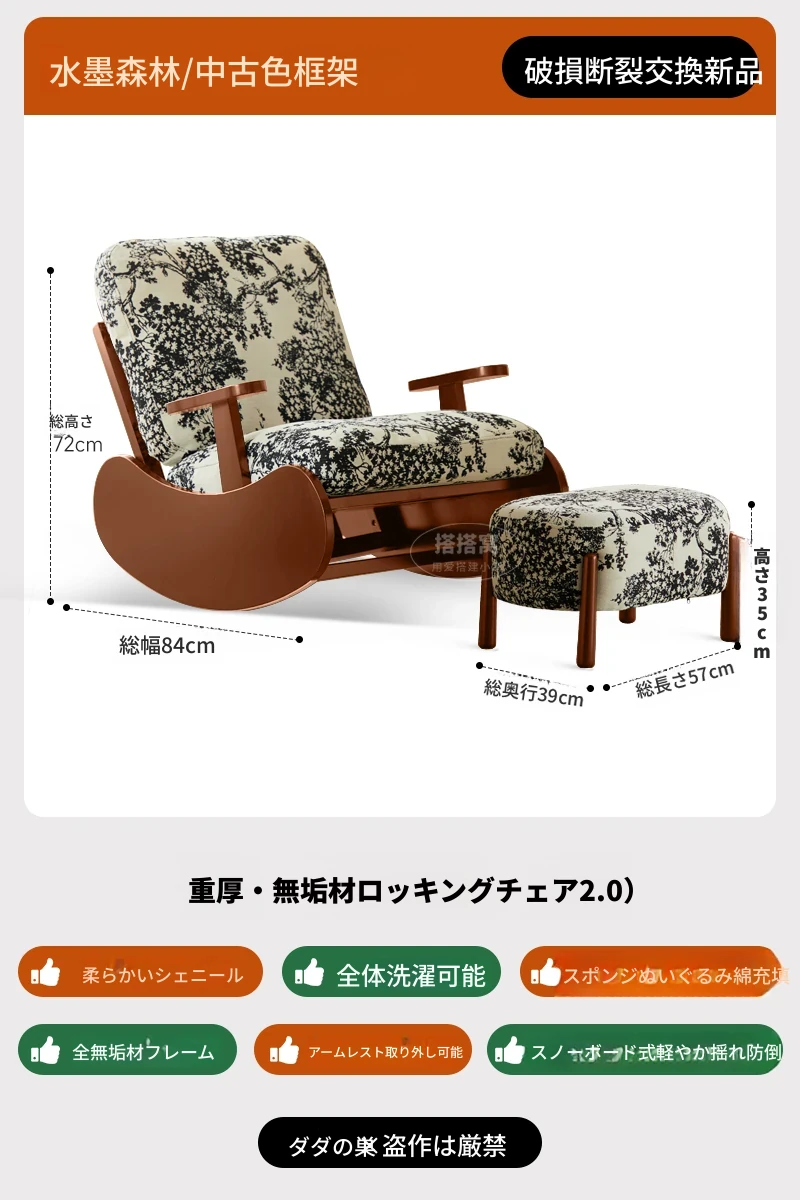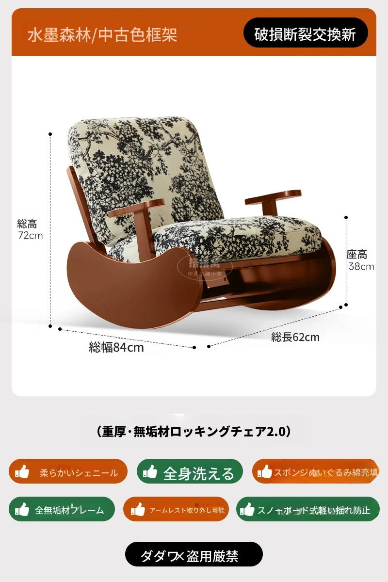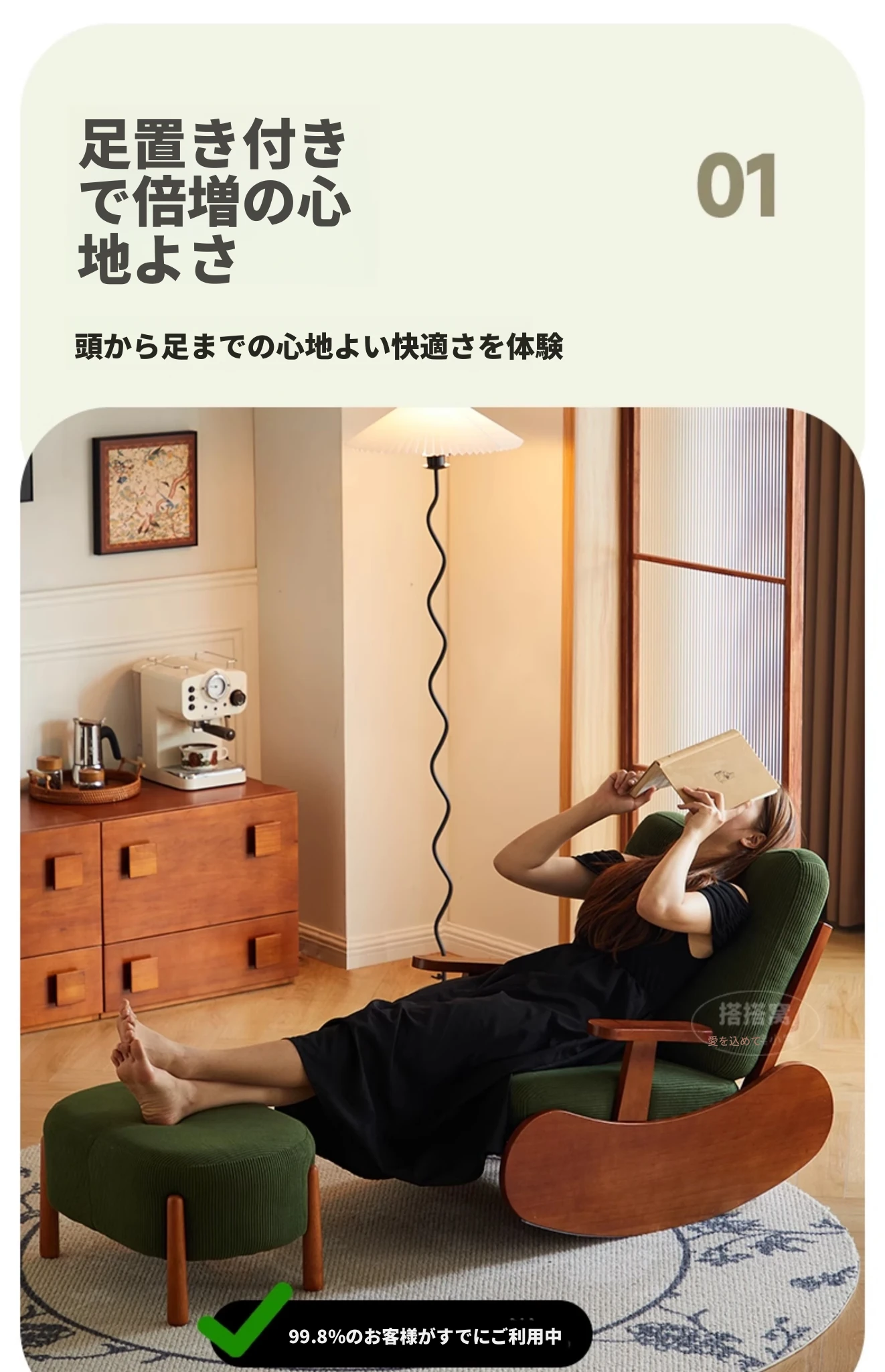 レトロな無垢材のリラックスソファ|家庭用・リビング・バルコニー・寝室に最適|寝転がれる・横になれる・おしゃれな洗える一人用ロッキングチェア|快適な休息のひとときをお届けします!