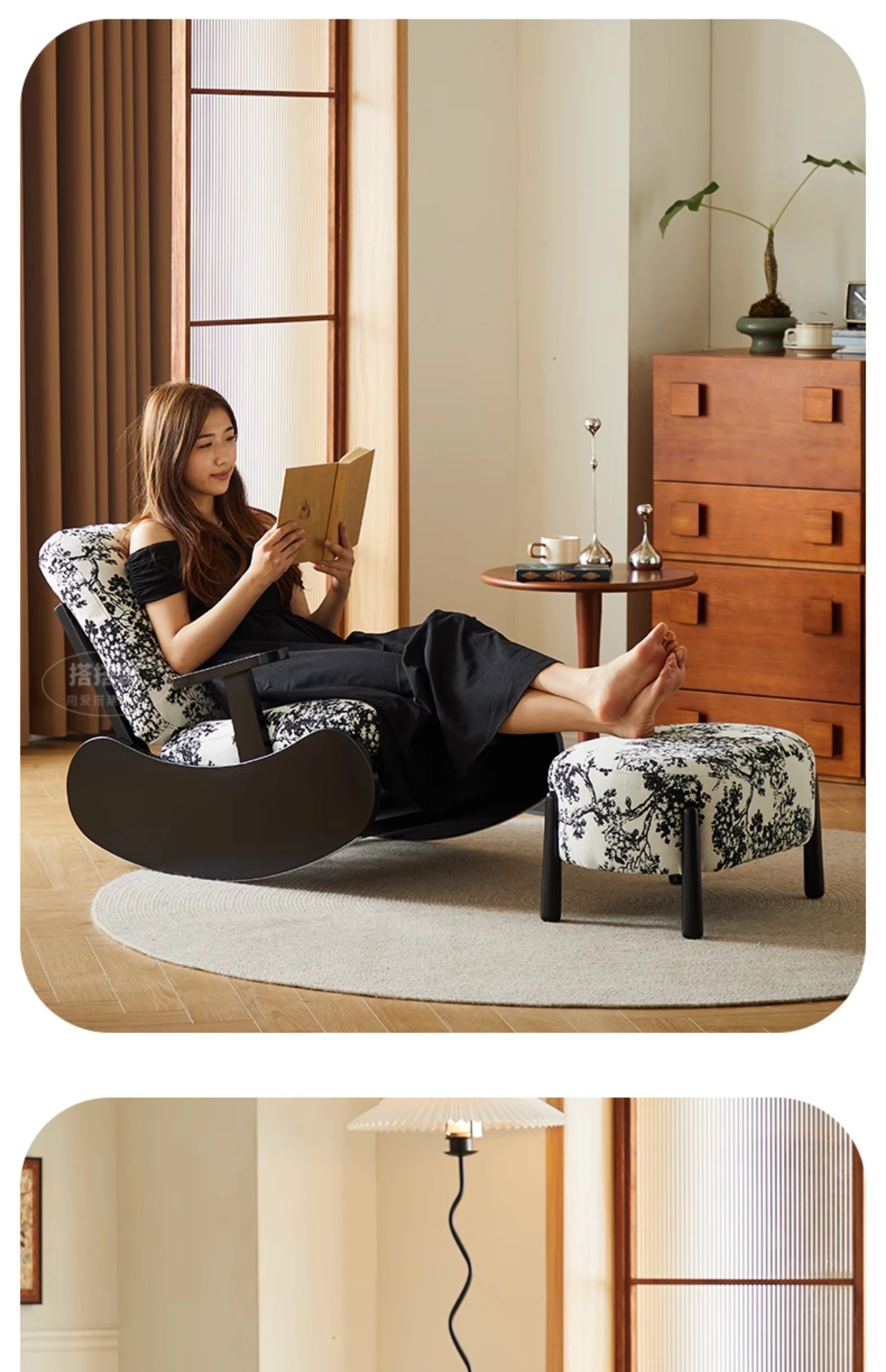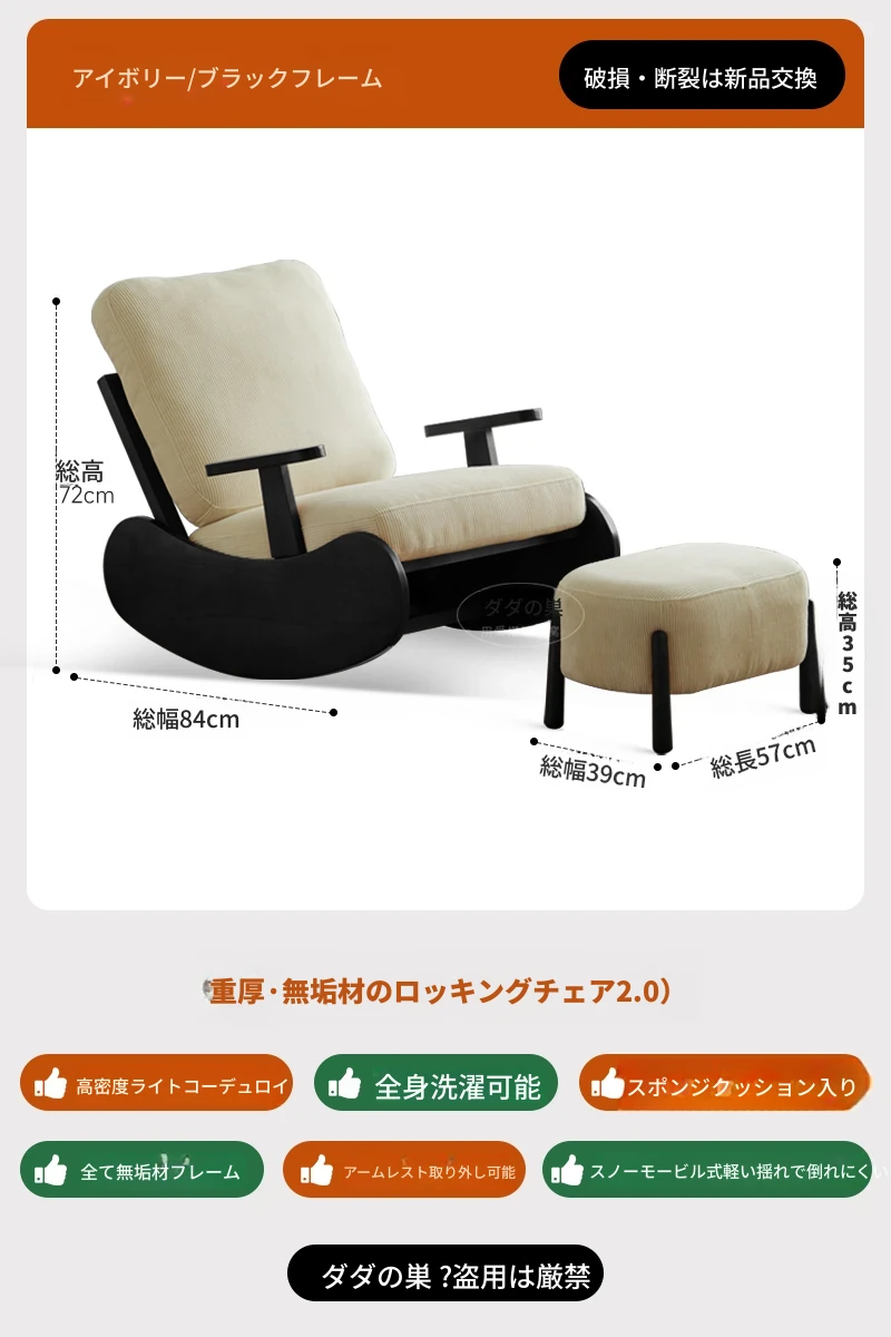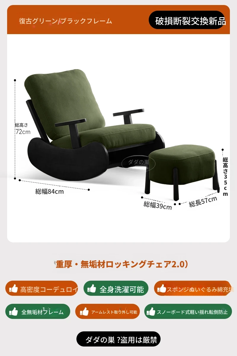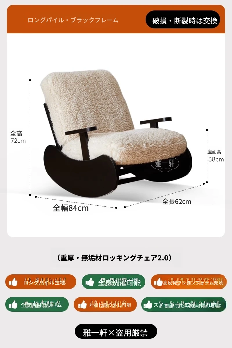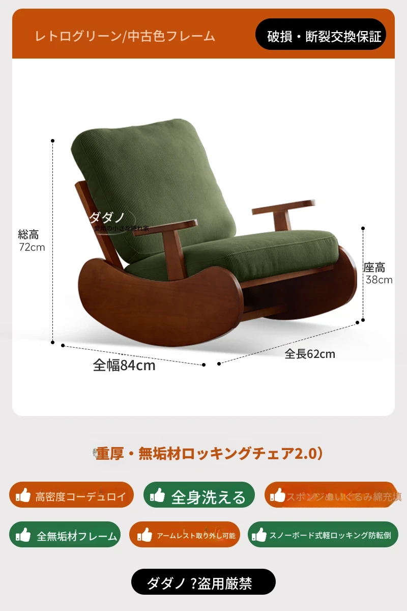 レトロな無垢材のリラックスソファ|家庭用・リビング・バルコニー・寝室に最適|寝転がれる・横になれる・おしゃれな洗える一人用ロッキングチェア|快適な休息のひとときをお届けします!