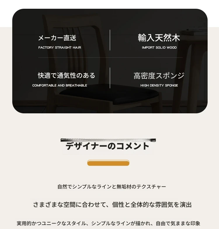 高品質な無垢材使用!シンプルでモダンなデザインのダイニングチェア。取り付け不要の便利な組み立て式!リラックスできる背もたれ付き、食卓を華やかに演出します。家族や友人との食事にぴったり!