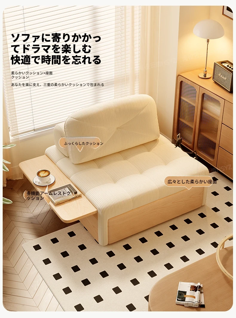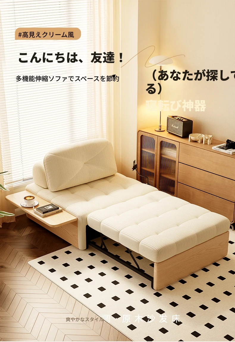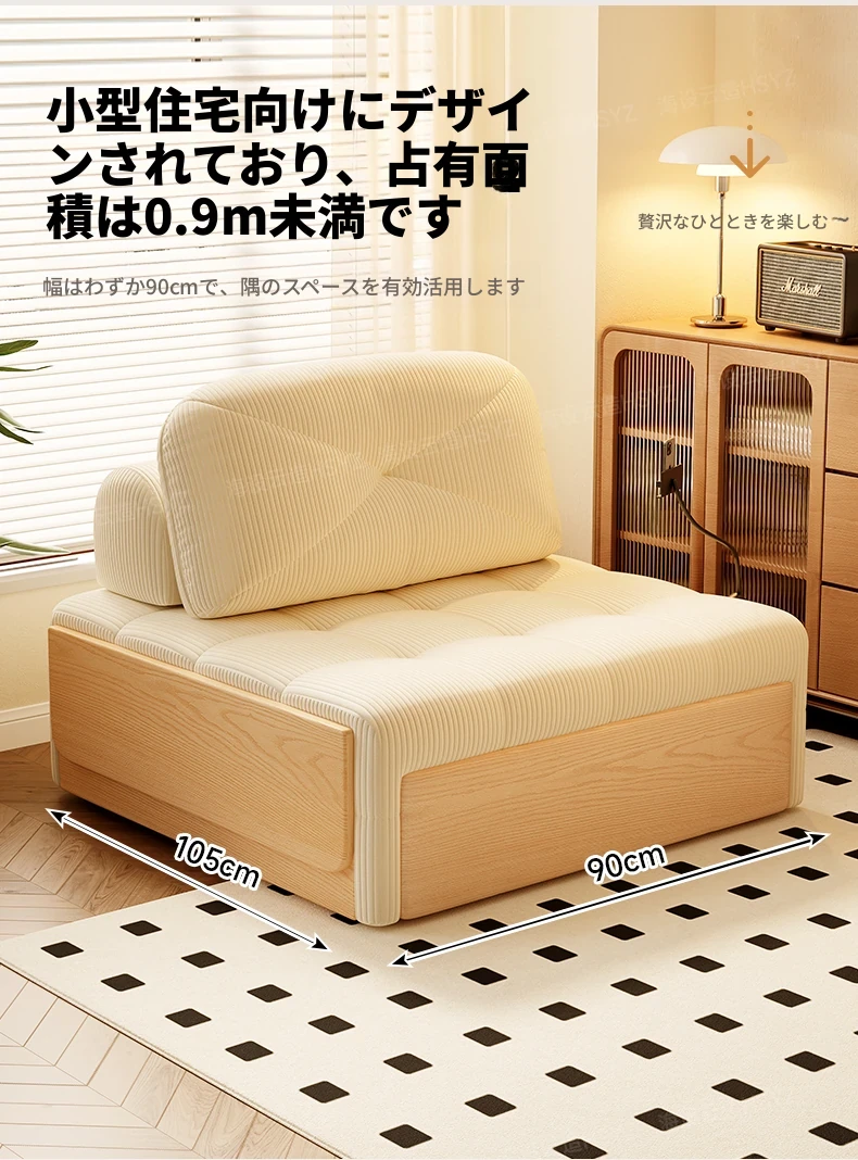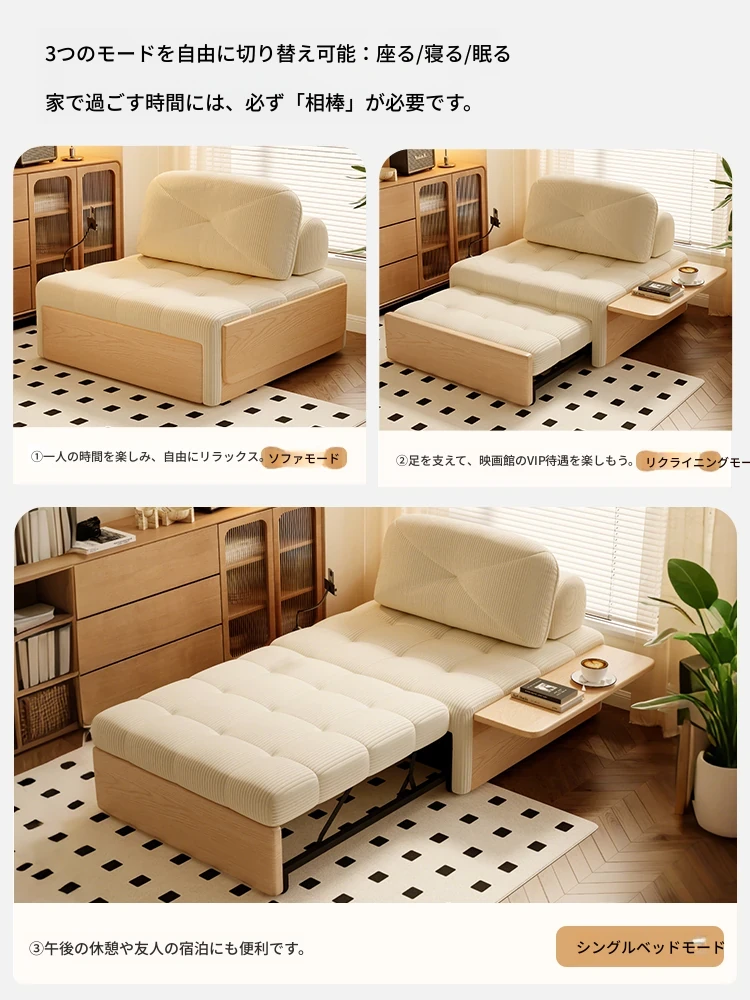 国産折りたたみソファベッド!シングル・ダブル両用の新型マルチ機能ソファ。バルコニーや書斎に最適なコンパクト設計、天然木使用で高品質!小さなお部屋でも広々使える!