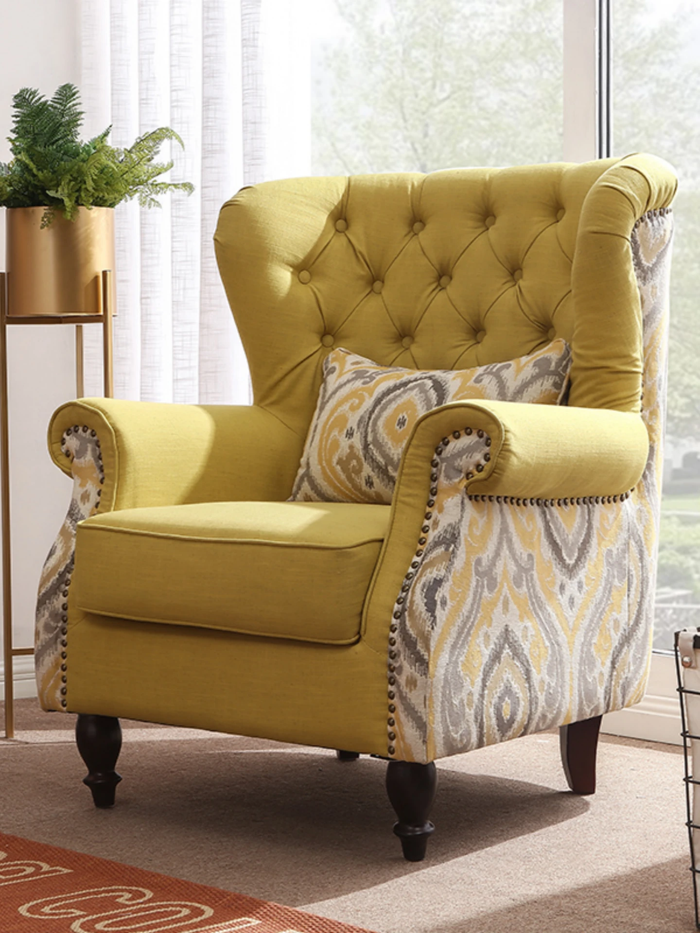 アメリカンカントリー風の黄色いリラックスチェア|小さなリビングにぴったりな一人用布製ソファ|おしゃれなトラ柄デザインで、くつろぎのひとときを演出!