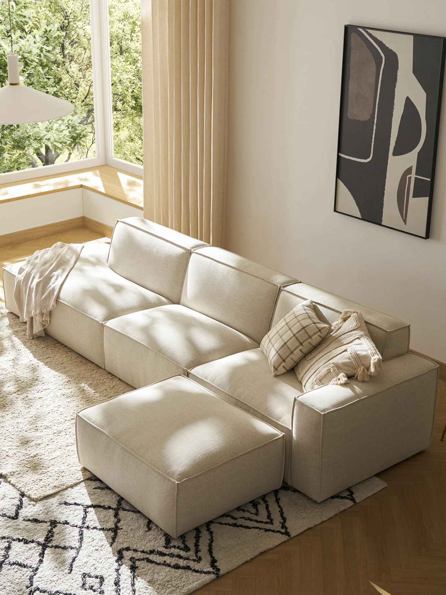 侘寂風デザインの高級コットンリネンソファ!モダンでシンプルな三人掛け、豆腐ブロックスタイル。小さなリビングにもぴったりのモジュラーデザインで、スタイリッシュな空間を演出します。