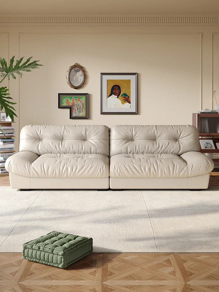 ラグジュアリーな雲のような本革ソファー - 上質な牛皮使用、フレンチクリームスタイルのコンパクトな三人掛け、スタイリッシュな豆腐ブロックデザインで小さなお部屋にもぴったり!
