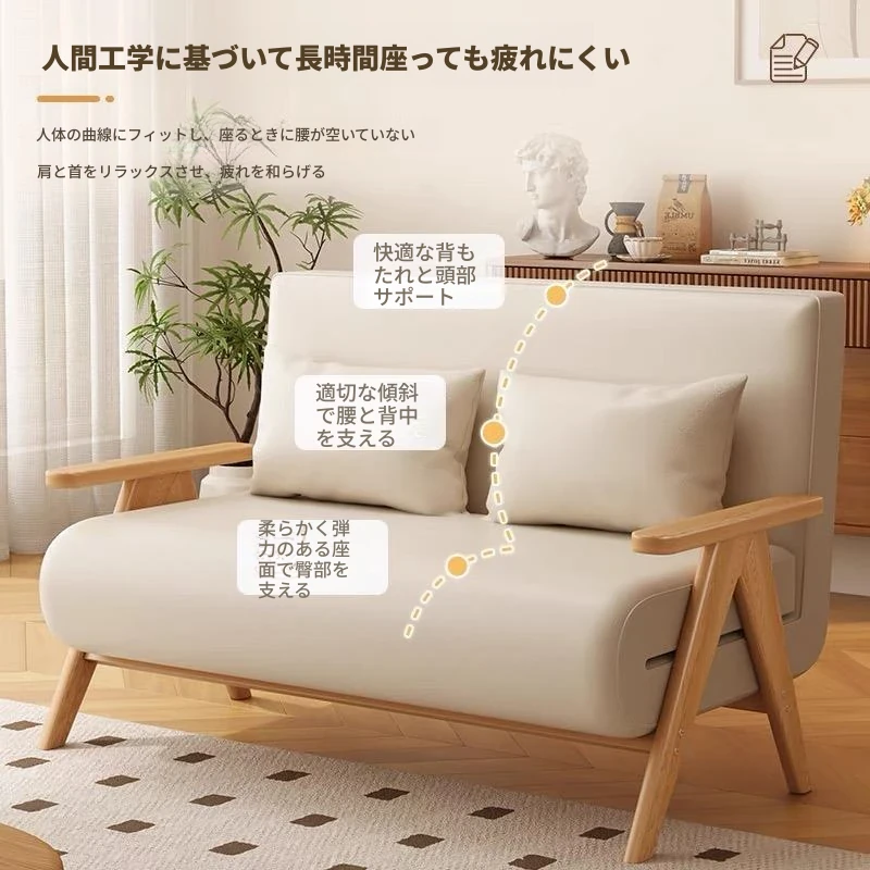 国産モダンシンプルクリーム風木製ソファベッド 小型居住空間向け 書斎に最適な座り心地抜群の折りたたみ二人用ベッド!リラックスしたいあなたにぴったりのアイテムです!