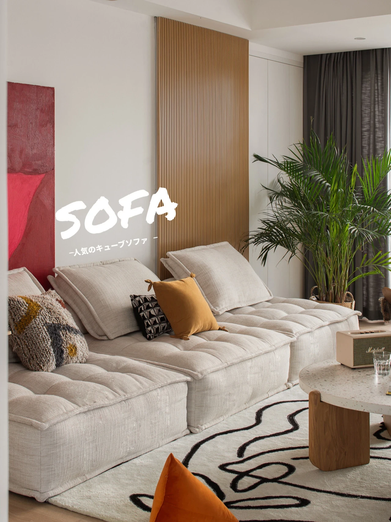 シンプルな小型リビングに最適!2人掛け・3人掛け対応の布製ソファ。コットンリネン素材で直線的なデザイン、アームレスの新作モジュラー豆腐ブロックスタイル。快適さとスタイルを両立したリビングの必需品!